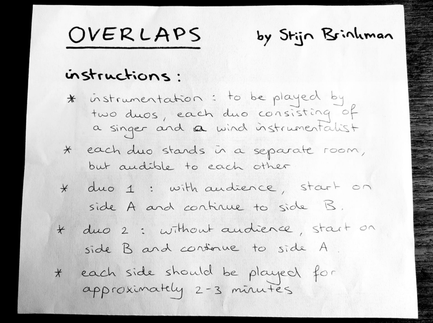 The score of OVERLAPS for the first duo: side A (left) should be visible, side B (right) should be folded to the backside © Stijn Brinkman
