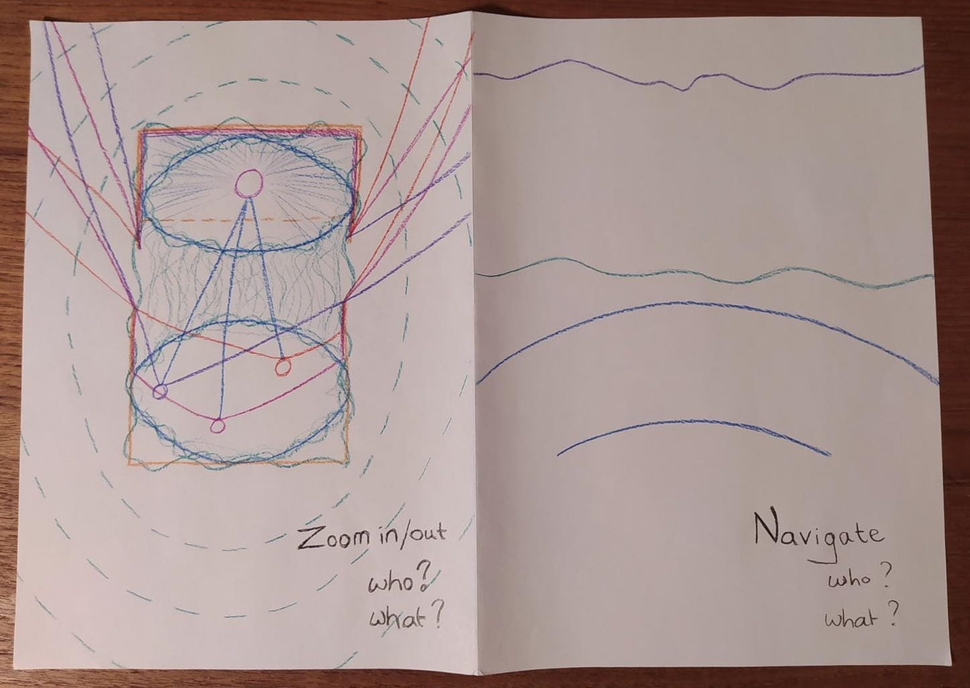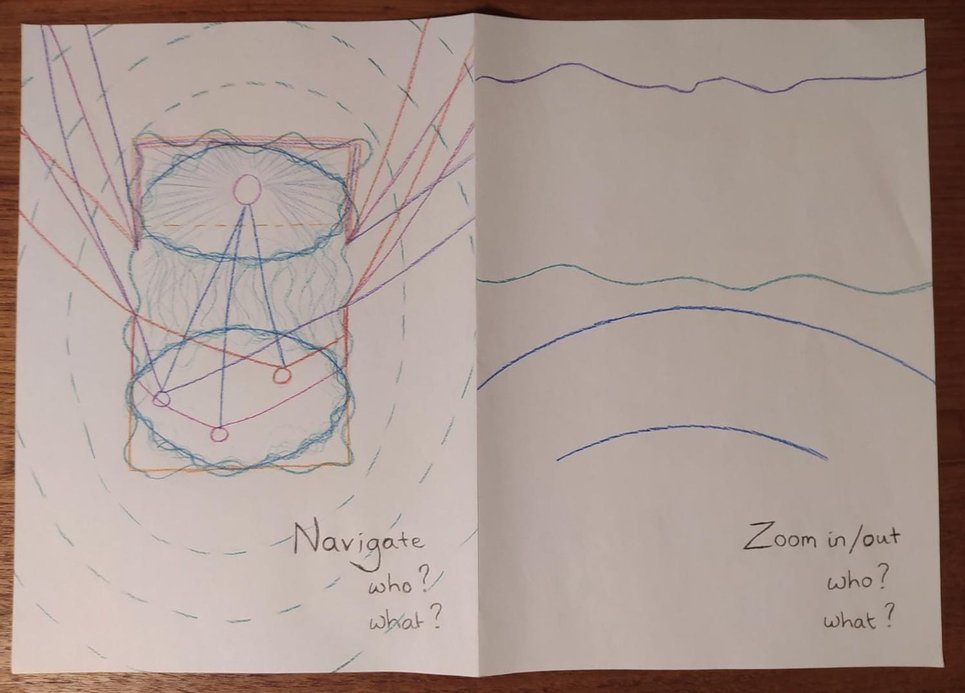 The two duos play the score at the same time, in separate rooms yet audible to each other. The first duo is playing in the room where the audience is, the second duo is in a separate room, all by themselves. One duo starts with side A of the score, and after 2-3 minutes (in their own relative feeling of time), continues with side B, also for 2-3 minutes. The other duo does that in reverse order. Although both duos play a different side of the score, the words on both scores coincide: side A (first duo) and side B (second duo) contain the words ‘zoom in/out: who? what?’, side B (first duo) and side A (second duo) contain the words ‘navigate: who? what?’.