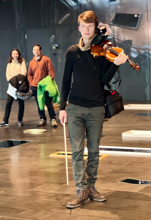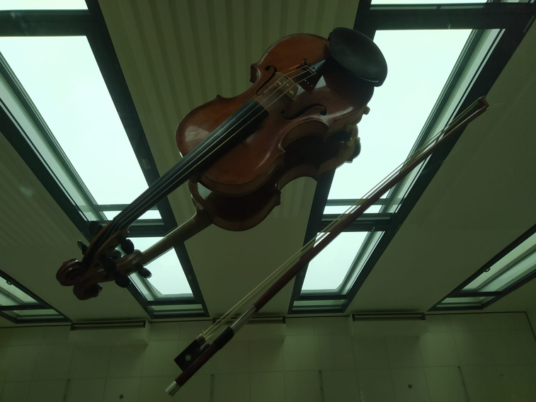 Eye Power was a performance to ‘erase’ the eyes of a performer: by lowering the agency of the performer (both me and the violin) in constructing the performance, the agency of the surroundings and audience as co-players became stronger. The performance happened in the Royal Conservatoire of The Hague, in cultural center Amare, for fellow music students and a teacher.4