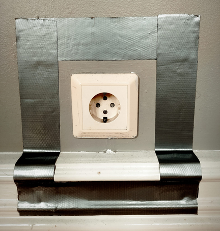 Just before the end, I narrowed the visual space to a wall socket, by creating a square around the socket with duct tape, framing the socket as if it was an art piece. Then I went away, out of the room to a different floor in the building, not returning for 15 minutes. Since I erased myself from the room, the audience members were left alone with nothing else to watch than themselves and the surroundings, visually transforming themselves from audience to main performers. According to a group evaluation afterwards, they didn’t wait in silence for me to return: they decided as group, two minutes after I had left the room, that the performance had ended.