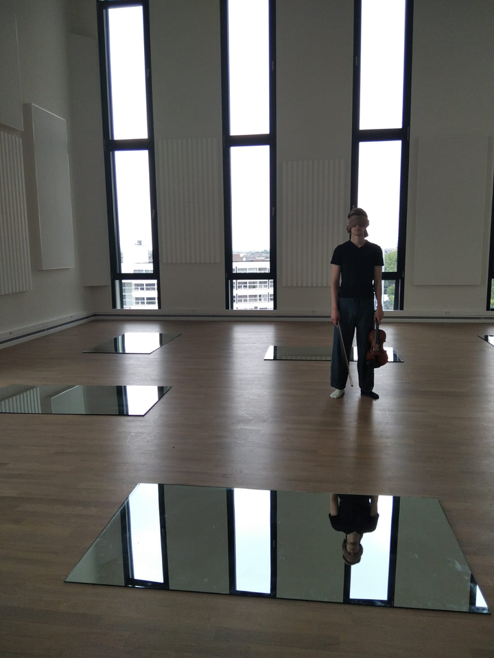 The floor was covered with 7 large mirrors. When the audience entered, I stood in the middle of the room with my violin and bow in my hand, blindfolded just as in Multi-Space. Again here I did not make any sound while pretending to play. Differently from Multi-Space, however, I continued performing soundless throughout the whole performance. My intention was to play with the audience’s expectations for the concert, turning a violin performance that was expectedly acoustical into a solely visual, physical performance.