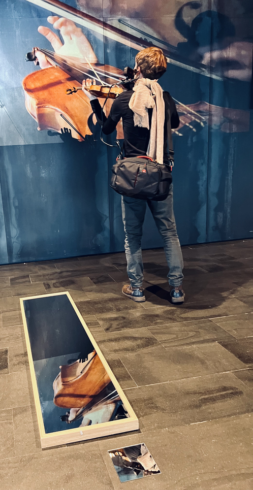 After the pretended playing in silence, I took off the blindfold and looked straight at the eyes of every audience member, directly or through the mirror reflections. The role of the violin transformed from an expected sounding instrument into an object as protagonist on its own, especially when I had put it down on the floor and joined the audience to watch it (as if it was going to play by itself), and when I placed the violin and bow on different mirrors around the room.
