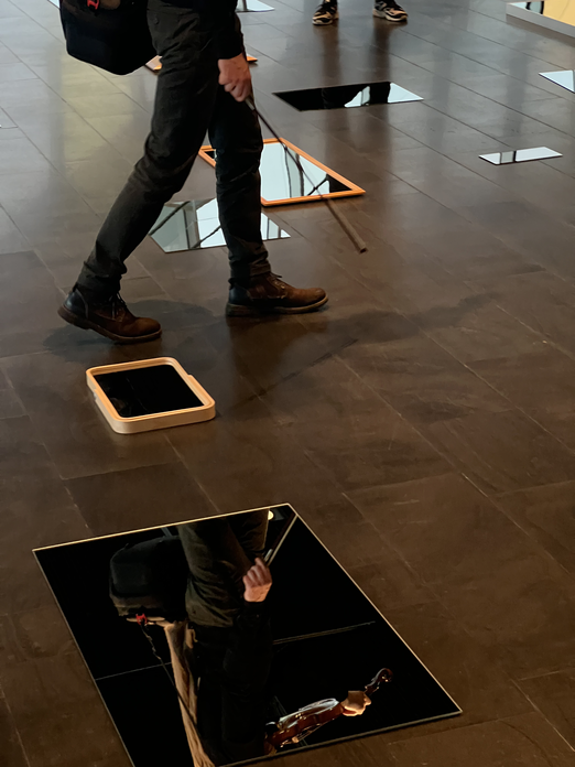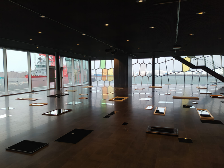 Multi-Space was an installation in Flói, a large open area in Harpa, Reykjavík’s most prominent cultural center in the heart of the city.1 Designed by renowned artist Ólafur Eliasson and architect Henning Larsen, Harpa’s façade consists of overlaying geometrical constructions of steel and glass (reflecting natural light during the day, and constantly changing color during the night), while the ceiling of the large hallway inside is completely made of mirrors. As a counterpart to this ceiling, Multi-Space resembled a sea of mirrors to walk through, visually connected by glass walls to the actual sea and harbor outside.