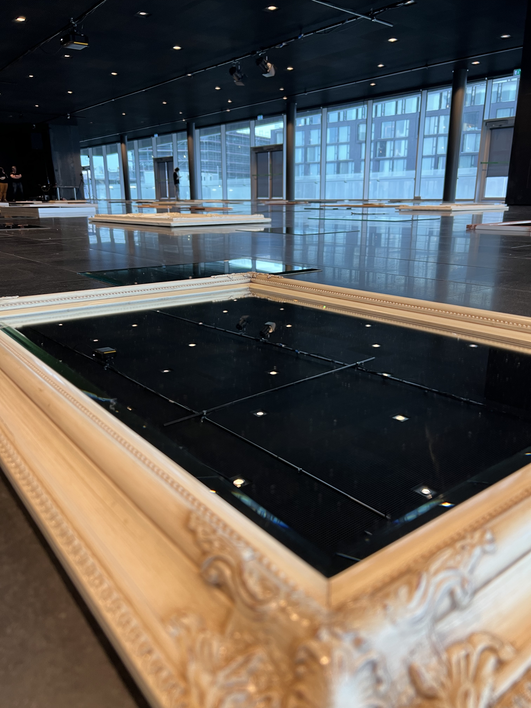 In Multi-Space, I found a way to narrow and widen performance space in the room (to challenge the domination of walls) by zooming in on certain elements and enlarging them in our spatial awareness. I was inspired by Live, in which the camera sometimes zoomed in on the wrists of the ballerina, making them more prominent on stage. I applied the same technique: for example, when I was filming a broken mirror, the projection wall displayed this broken mirror. While the mirror had been just a small element, maybe even in the dark or ‘hidden’ for some audience members, it suddenly became a main element dominating the screen. This felt for me like a molding process: by enlarging a certain element in our spatial awareness, other elements in space seemed to get forgotten and get smaller. In Eye Power, I applied the same process: by framing an energy socket on the wall with duct tape, I suddenly drew focus to that element, transforming the socket into the main performance stage, while the rest of the room seemed to go further away. In Multi-Space, I applied the same strategy the other way around as well: when I moved out, I turned around to film Harpa – in which the installation room was just a small part. This way of zooming out to the complete building helped me to question Harpa’s relation with the surrounding city, hotel and 66° North store by constructing narratives of materialism and voyeurism.18
