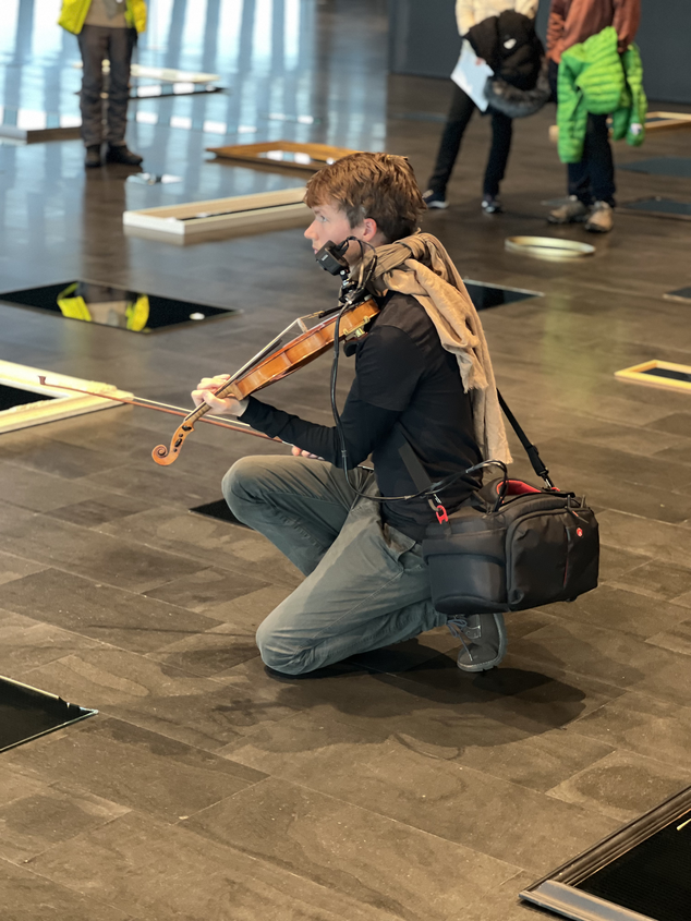 In Out There, binoculars enabled the audience members to literally zoom in/out: the binoculars literally turned me from an imagined, hidden performer into the center of their focus. For my performing partner Bergþóra, the binoculars became a tool to make a duet from afar possible. By crossing the boundaries of acoustically separated spaces, as if visually and physically pulling the spaces together, we extended existing spatial boundaries and made the audience become aware of them. At the same time, zooming in/out didn’t only happen through the binoculars, but also with shifting attention, focus, exploration, imagination and the feeling of radiating elements – as was demonstrated by the example of my violin body being in risk outside, a thought that was ‘pulling’ the audience through spatial layers.