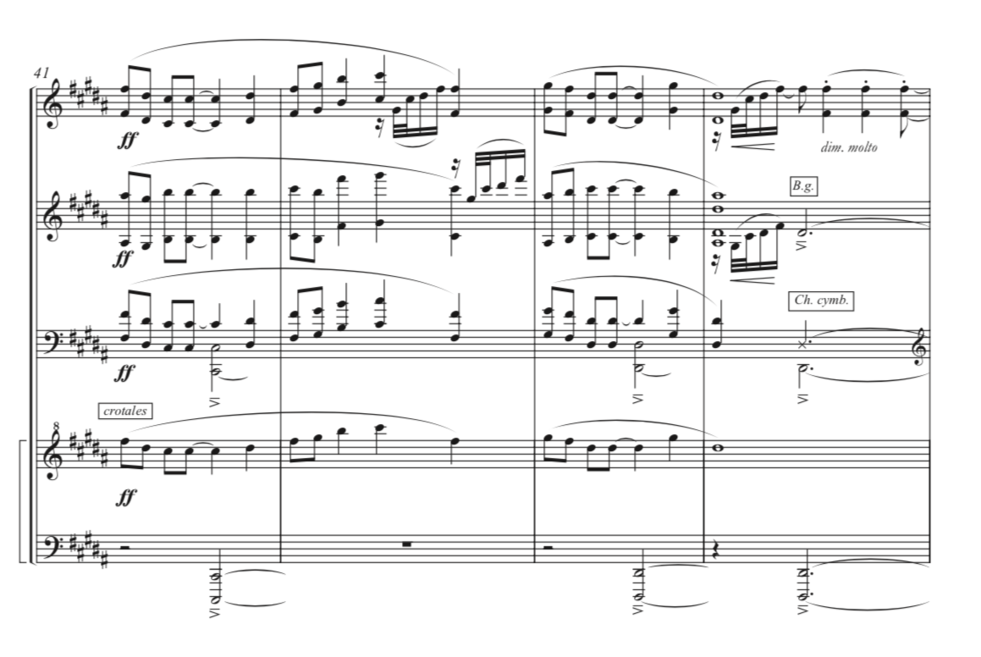 Moving forward, I wanted to highlight the crescendo from bar 37 to a climax in bar 41, where we see a fortissimo for the first time in the piece. After a build-up of four bars with an ascending melody and a fast and anxious motive that moves up and down repetitively, we reach a fortissimo where Holló writes the melody in unison in all parts and in various instruments and registers (vibraphone, marimba and crotales). This melody is accompanied by eruptions of the fast motive (shared by the two vibraphones), finishing this section with a hit on the cymbal and the Burma gong (supported by the bass line in the marimba and the sampler) that creates the resonance from which the next section is born. This section marks the return of a melody played by the first vibraphone in piano which has already been heard before but with the addition of an accompanying motive in the second vibraphone. The melody is later doubled in a different octave by the other vibraphone, with the glockenspiel playing trills with soft mallets (to match the sound of the vibraphones) in a beautiful texture that makes a bridge to the re-exposition of the first theme of the piece.