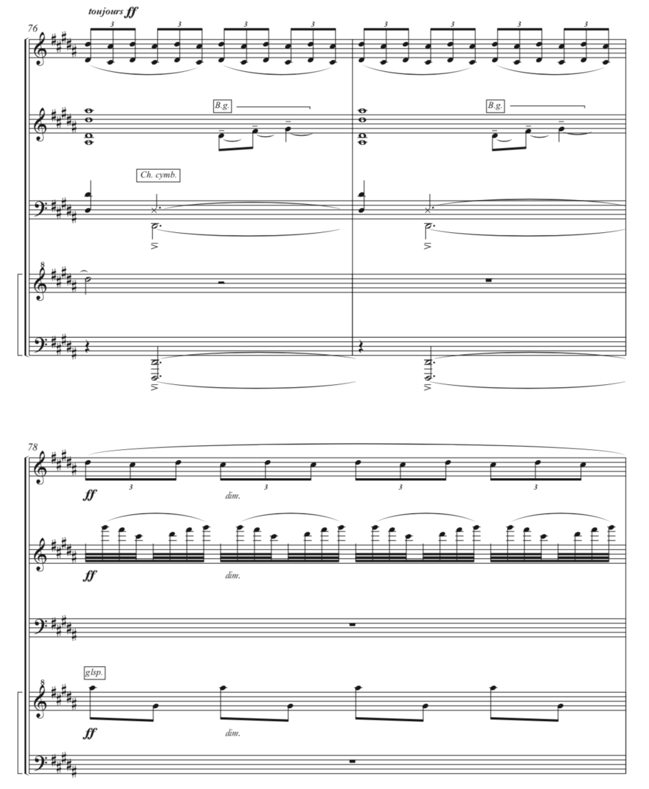 In the Coda Debussy shows again the melodies that have already been presented before, but in a lower register and under a cloud made by the cascading motif in the right hand, until it finishes in a beautiful B major chord with a sixth and a ninth. In Holló’s transcription the cascading motif is played by the second vibraphone, while the other instruments paint the atmosphere around it, with the melody in the vibraphone 1, tremolos in the low register of the marimba supported by the sampler, and glissandi in the black keys of the glockenspiel.