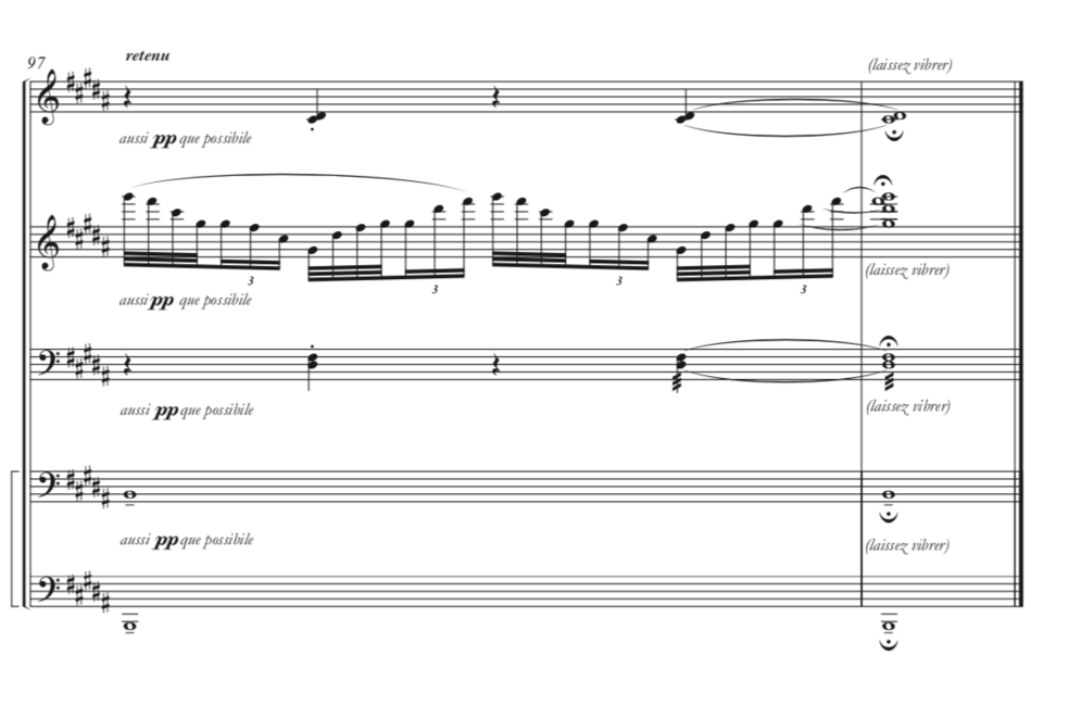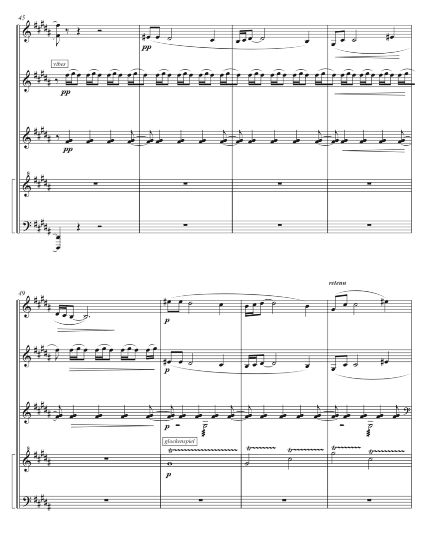 In the last six bars the marimba helps the vibraphone with colouring and resolving the melody, while the Burma gongs play B every two bars, with a truly hypnotic and fluctuating feeling until reaching the final chord.