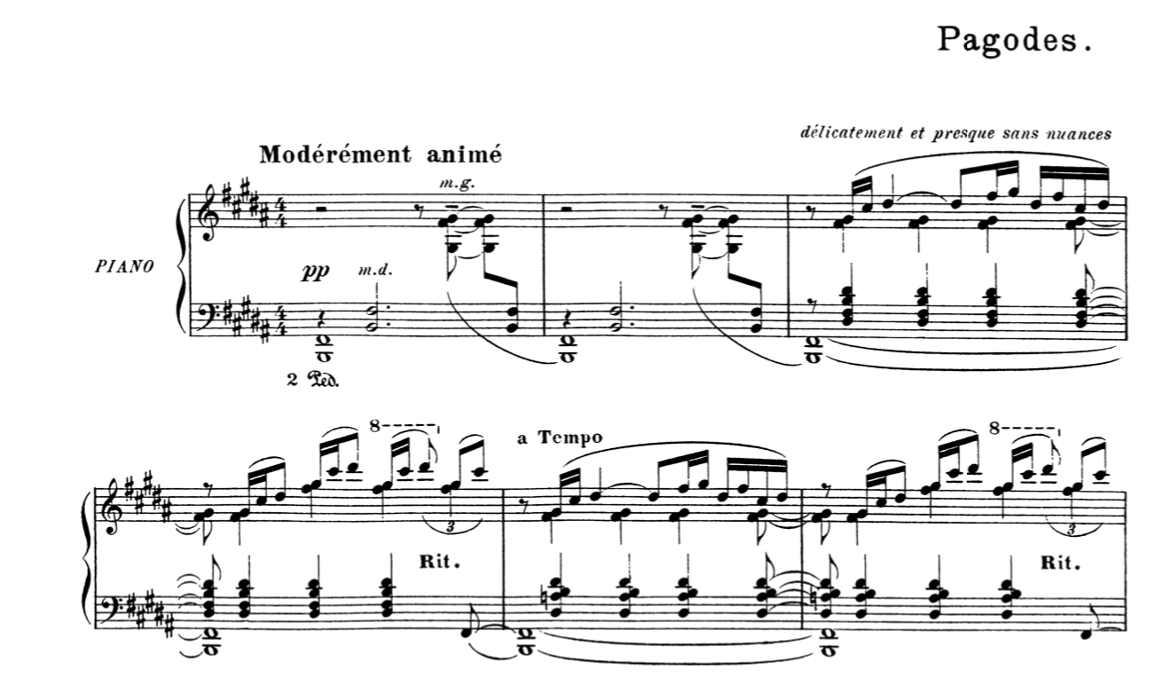 Like Et la lune Descend sur le temple qui fut, in Pagodes, Debussy explores the use of musical idioms from Oriental music, with particular highlight to the Javanese gamelan. The piece is filled with space and resonance and constantly uses several pentatonic melodic lines to make the connection to oriental music clear. But in spite of the clear gamelan music influences the piece is, both structurally and harmonically in western form.