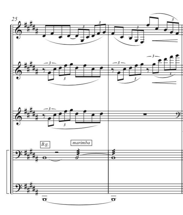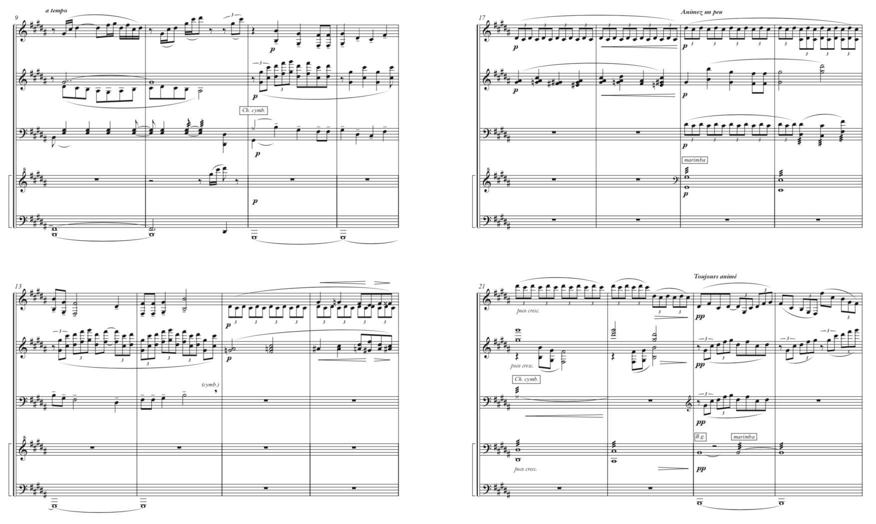 This section is followed by a more minimal four bar phrase, written just for the two vibraphones, where a simple melody is accompanied by an uneasy repetitive motive of triplets in two notes. This motive continues and is expanded when we get to Animez un peu in bar 19, whose entrance is marked by a crescendo from a piano to a piano: i.e., a crescendo until bar 19 and a subito piano at the beginning of the bar. This transition is beautifully translated in Aurel Holló’s arrangement, and impeccably interpreted by Amanda Percussion Group. The triplet motive is shared between the marimba and the first vibraphone, in different octaves, the melody and ascending chords are written for the second vibraphone, and the most important line in this four-bar phrase, the base line played by performer 4 with tremolos in the low register of the marimba, with very soft and highly resonant mallets. This bassline, in this transcription, is responsible for the change of colour at the piano subito in bar 19, and for leading the crescendo until bar 22 with the help of the tremolos, in an effect that is incredibly expressive and impossible to reproduce in the piano.