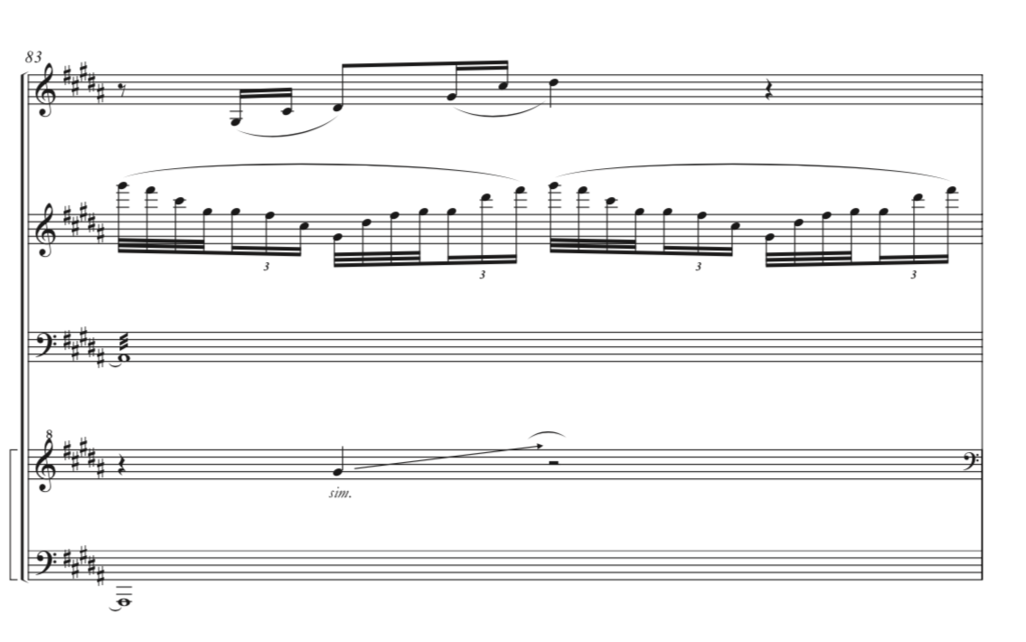 In Holló’s transcription these layers are perfectly represented, both in terms of register and colour. For the two introduction bars, Holló chose instruments with high resonance, the marimba and Burma gongs. The pedal note in the bass is played in a low Burma gong in B and a sampler to reinforce and give power to the bass, and the other two layers of this dance-like ostinato are written for marimba and another set of higher pitched Burma gongs. The arrival of a melody introduces us to a new instrument, and therefore, to a new colour: the vibraphone, with syncopated accompaniment played in the marimba and another vibraphone. As the melody goes up in pitch, Hollo makes use of the glockenspiel in a beautiful continuation of the colour of the vibraphones in another register.