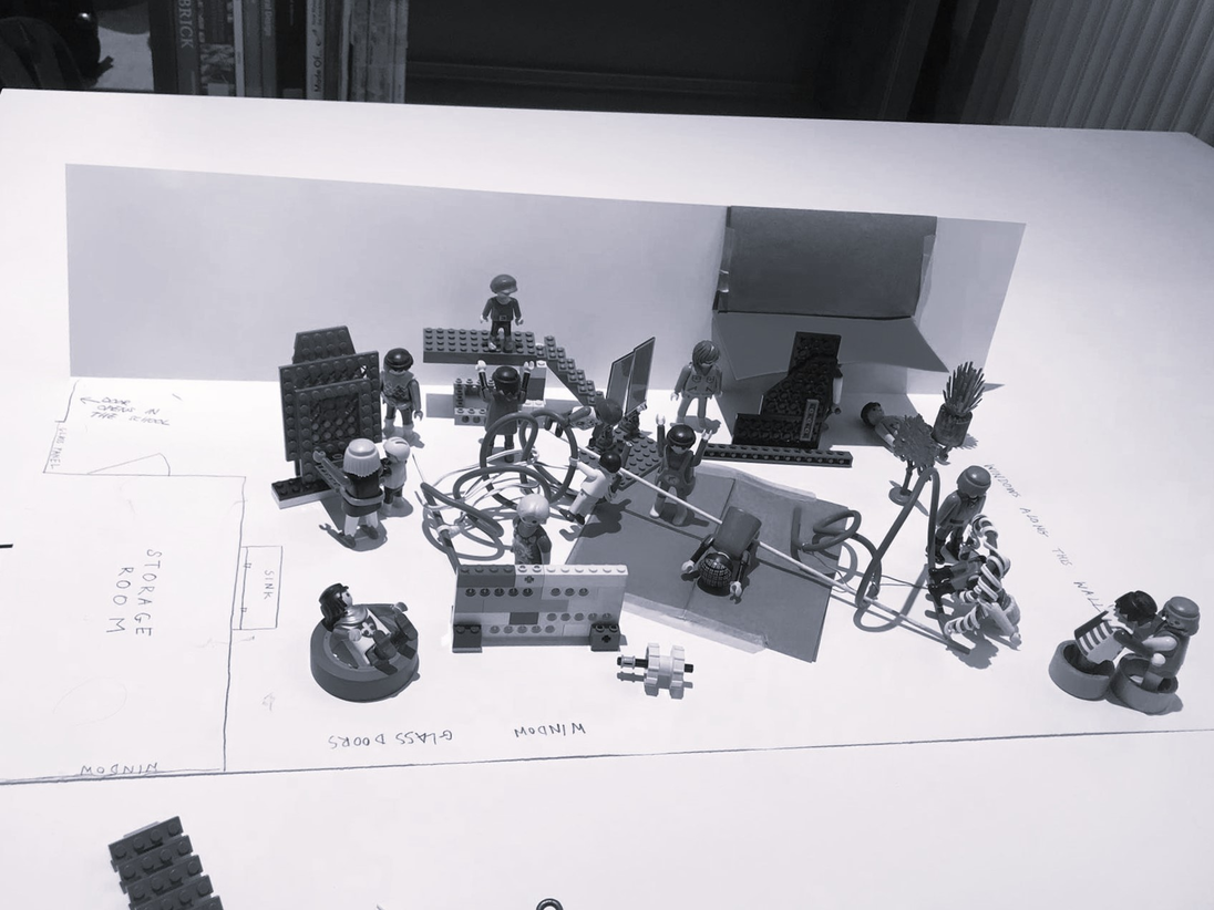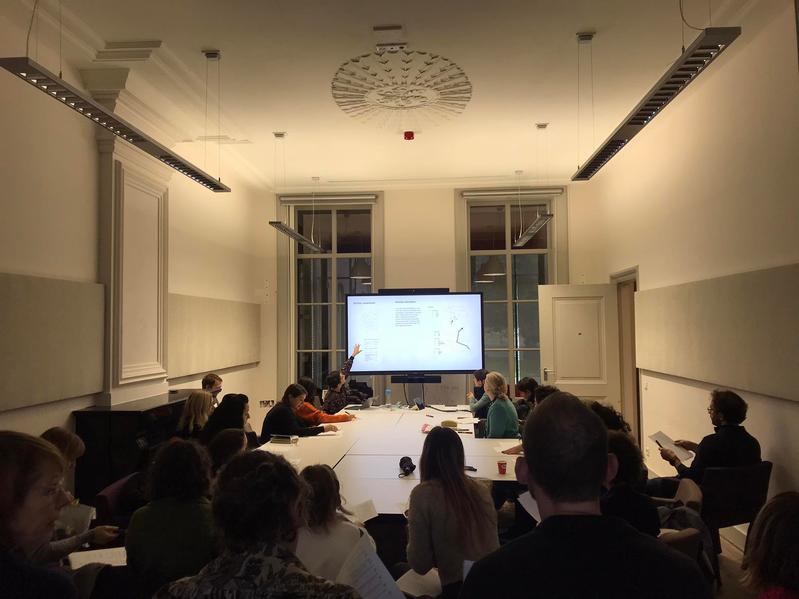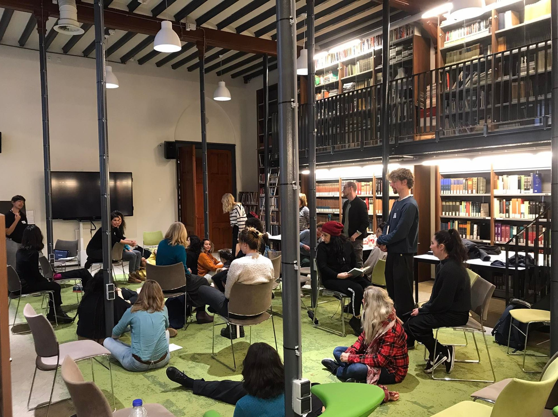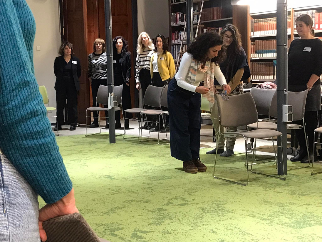 A rather remarkable game unfolds, where chairs are placed in funky ways and books are brought in like props in a theatre. Slowly, a cacophonic constellation of chairs, books and bodies is taking shape. Towards the ending, everyone has found their place. Interestingly enough, so Danae remarks, everyone is facing the same direction, namely: the direction from where we were given instructions. Apart from one person, who is looking in the other direction. Away from the one who, in this situation, is in the position of being the authority.