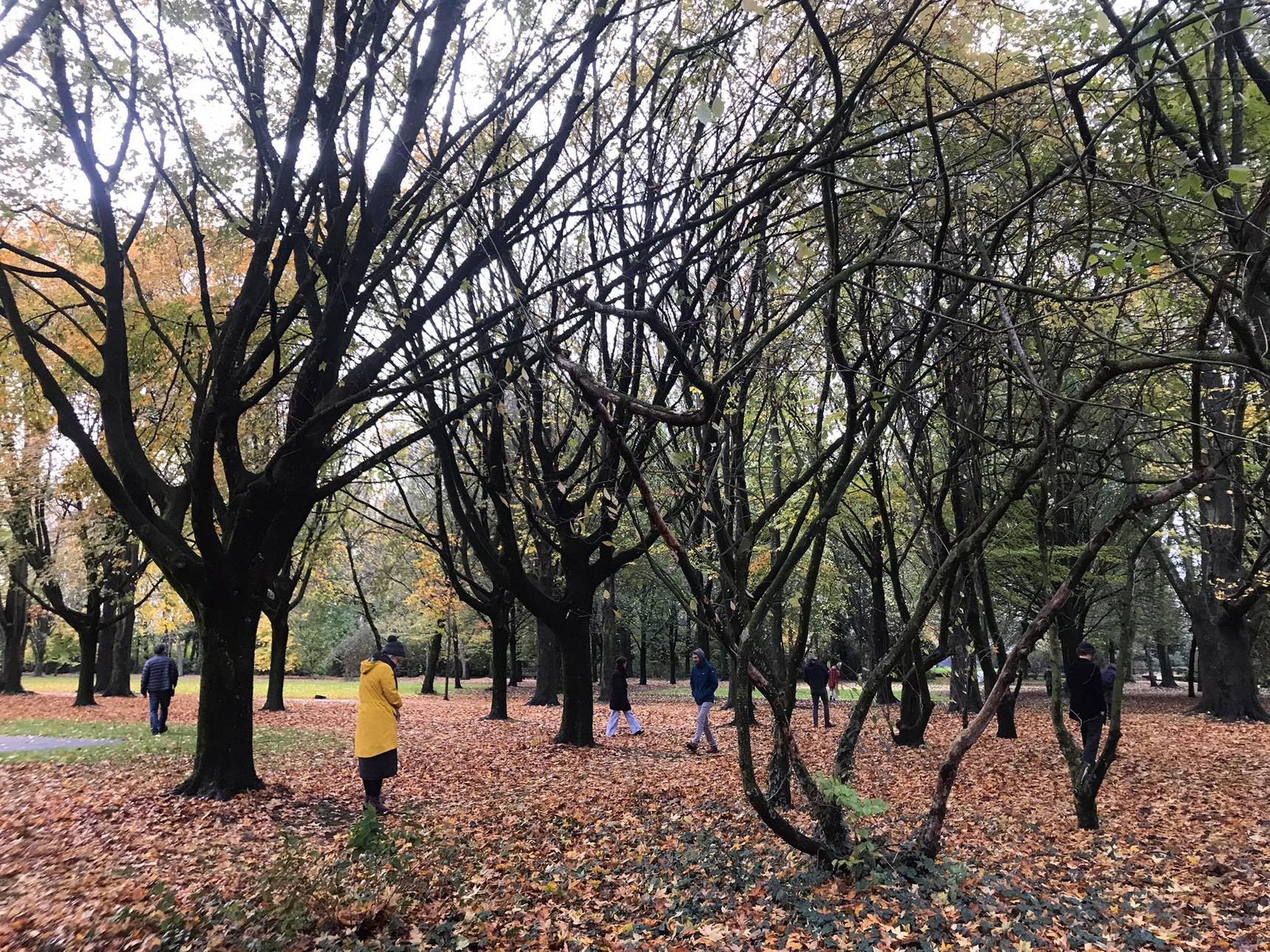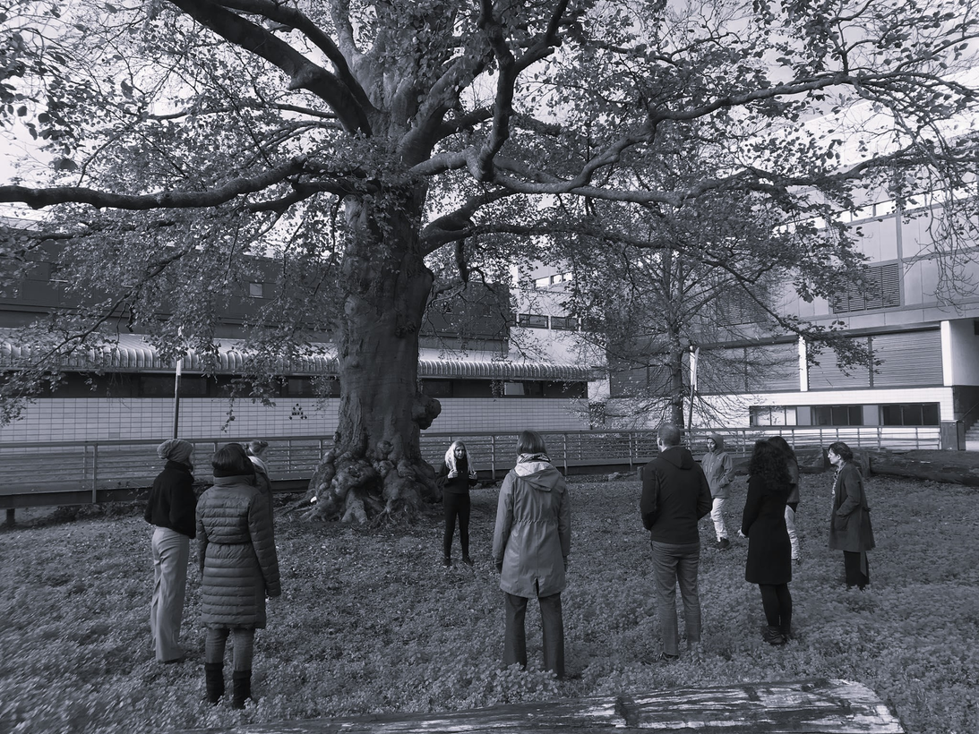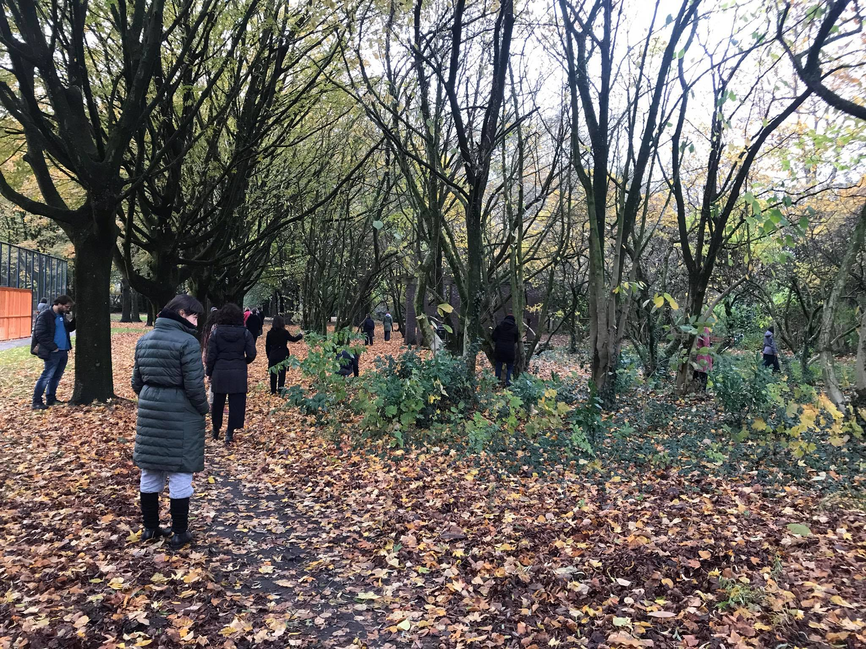 It strikes me that we are spending time together but apart. We are asked to perceive the space individually in silence, yet stay together as a group. There is something that touches me when I look at all these individuals, wandering around the park, looking for … a connection? It takes some time for me to connect to the rhythm of the trees. In the beginning I’m too occupied with my role as the anthropologist-observer with the task of writing this report. Then, at some point I’m able to let this go, and surrender myself to the mesmerizing details of a piece of moss on the trunk of a tree.