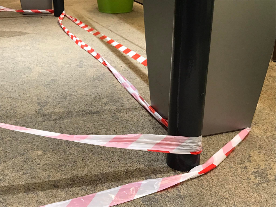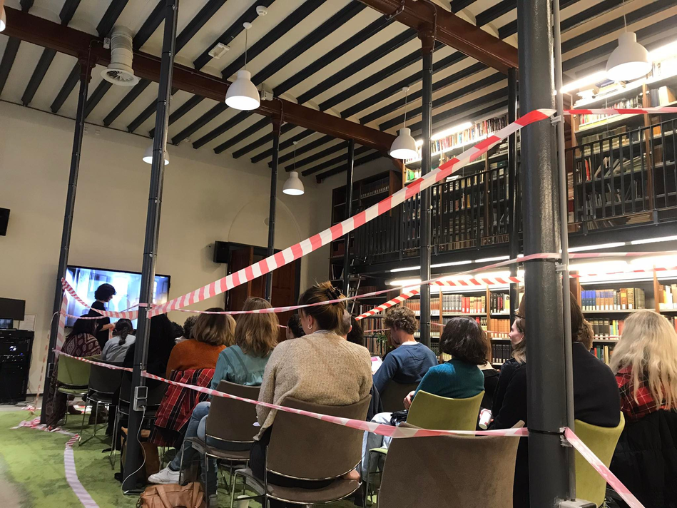 During their performative presentation the column-room was transformed. As Lizzy was speaking, Katy installed construction tape around the audience, making a clear separation of spaces. Through these red-and-white, plastic barriers, the space which I shared with the other audience members was being highlighted and transformed. I felt likeI was being imprisoned and at the same time becoming more intimate with my fellow audience-members (fellow inmates?). This performative gesture made me think of protest- and crime-situations. But I’m not sure if this was right, nor how it would relate to specific artworks in the past, for I couldn’t hear what was being said. What would be the source of this performative gesture? What in which artwork of the past inspired Katy and Lizzy to revisit and reactivate in the form of this particular gesture?