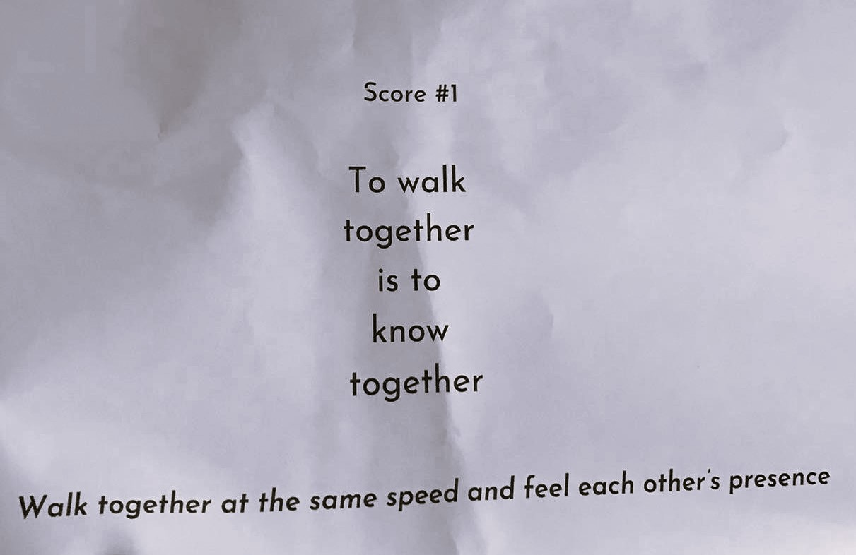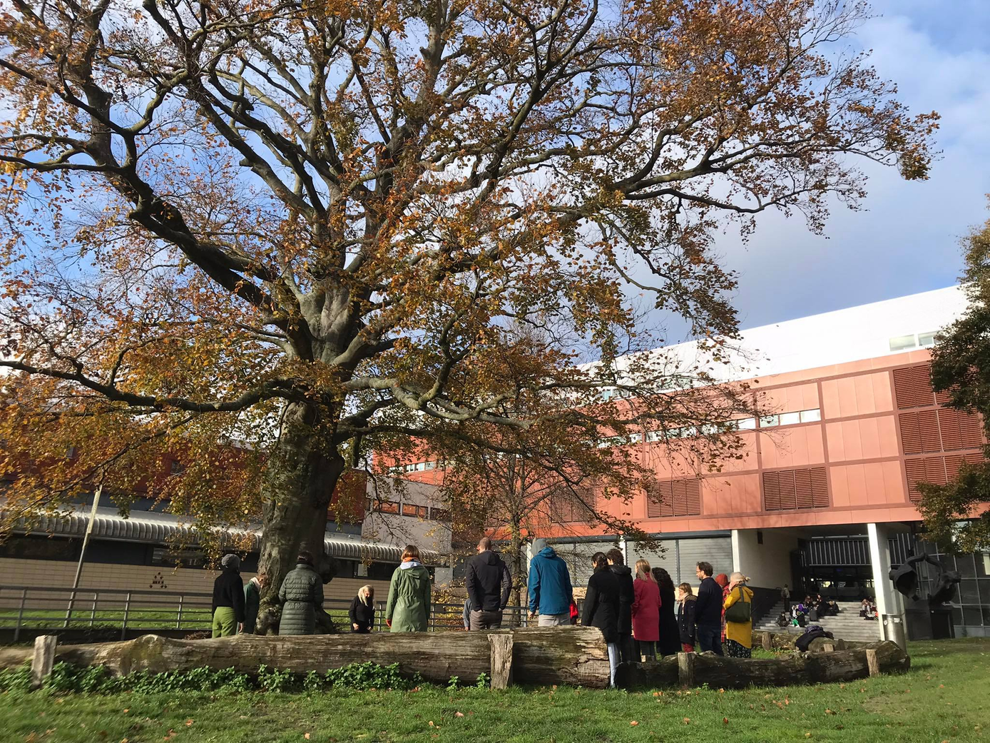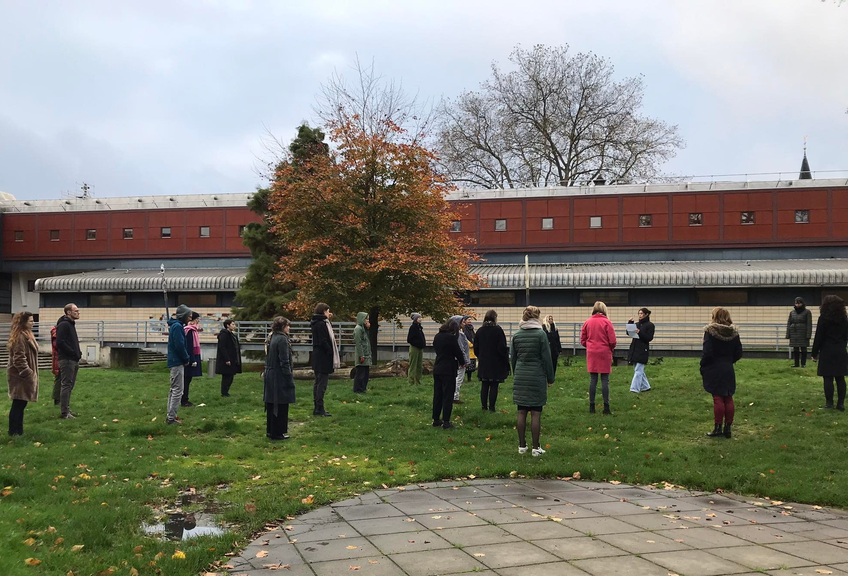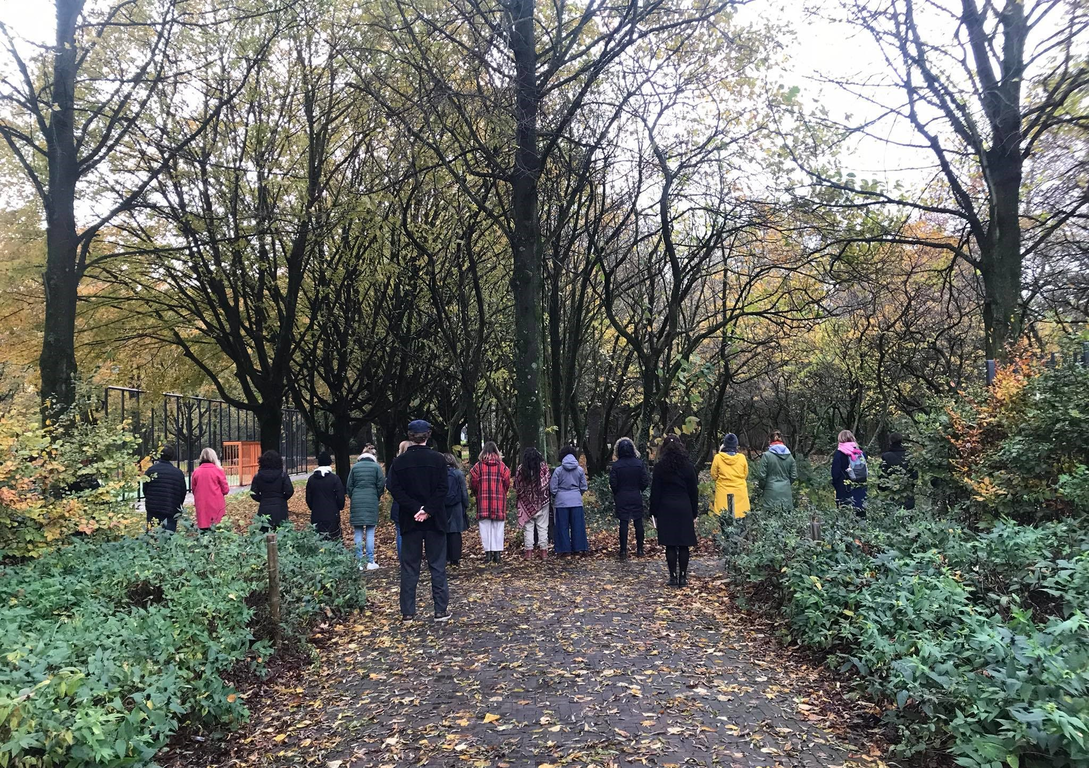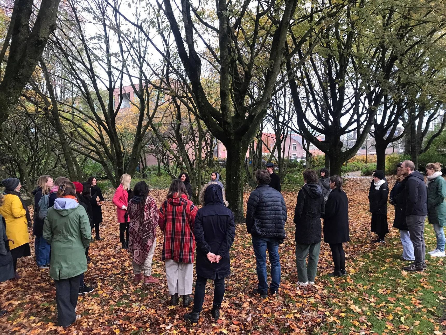 After a meditation that slows me down and makes me calm, we are asked to stay silent and follow Walmeri to the city park ‘Oude Dijk’ (old dike), just around the corner. As we arrive a row forms itself next to Walmeri. We are looking at the trees, the leaves, the football court. We have been instructed that this is what we’re going to do: we are going to stay silent and perceive the space so as to feel the space.