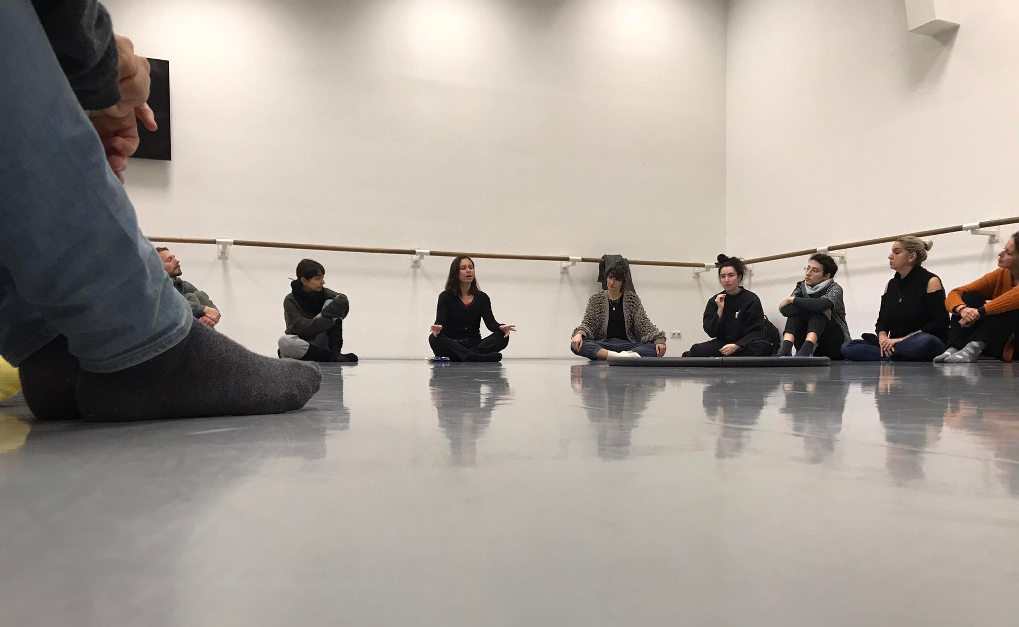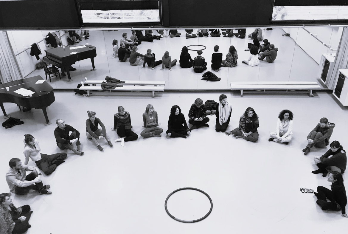 [Circular arrangement | squatting position | unguided meditation invited by artist]