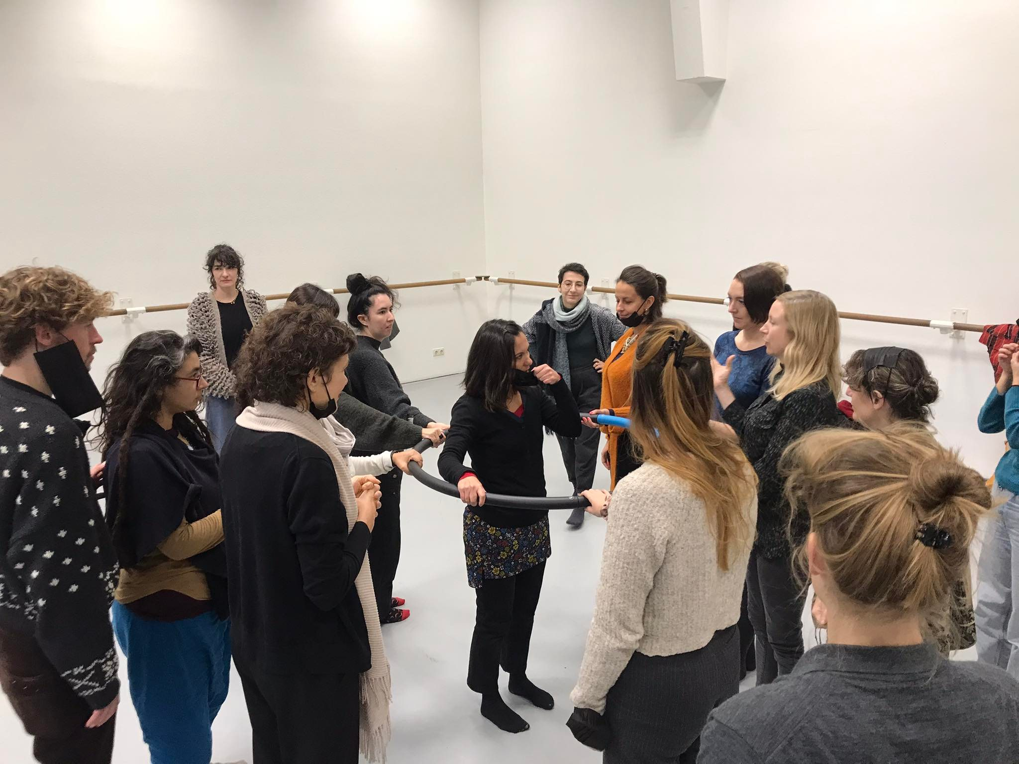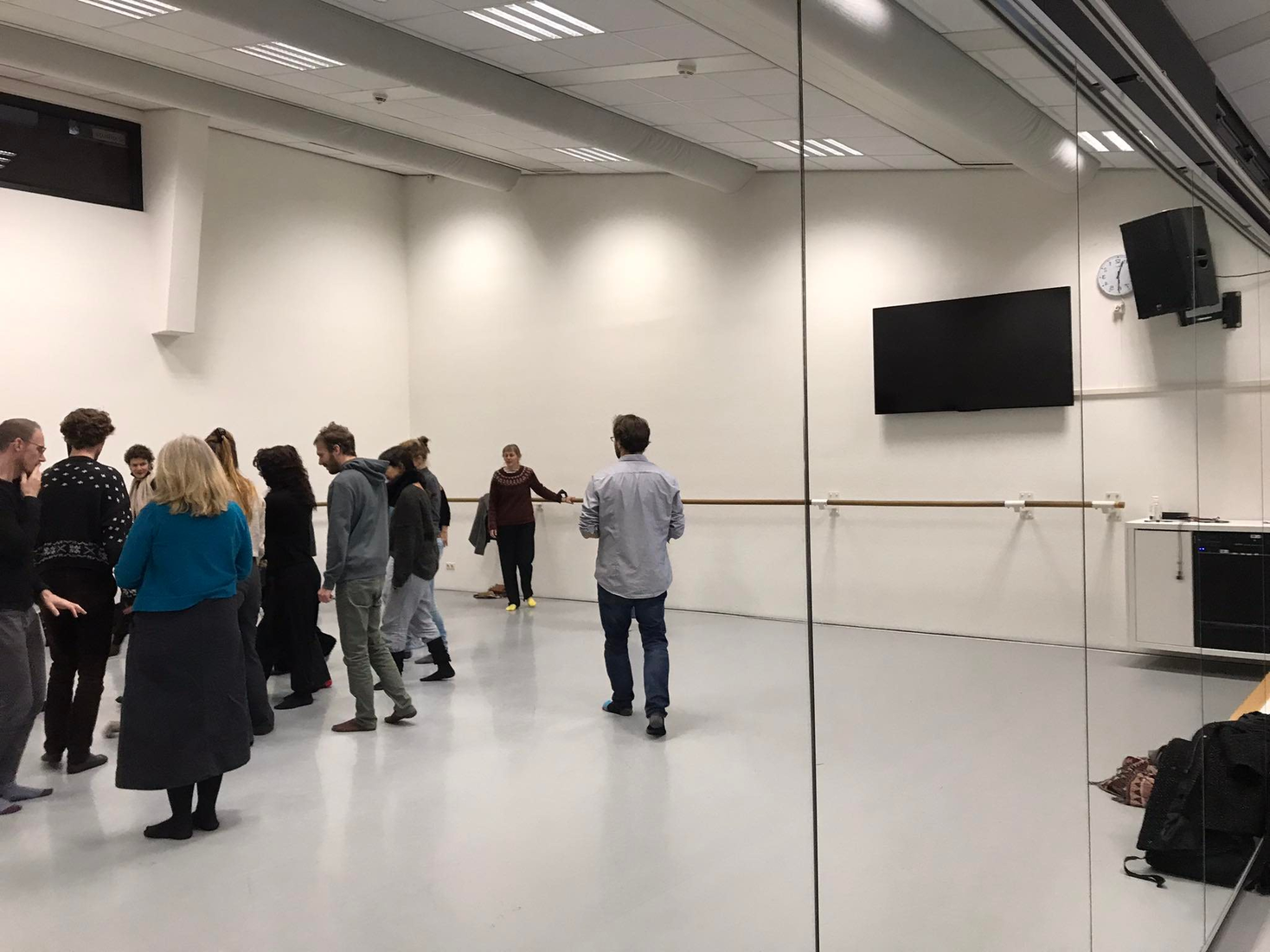 A major point of reference for the critical discussion that follows, is what happened in the contribution of Eleni Kolliopoulou earlier that day in the dance studio. At the end of this session, during another conversation, strong sentiments of objection and critique were uttered. One of the strongest utterances I recall is: “It’s unethical to trigger fear in any practice”. Apparently, this workshop did trigger fear for some. Not only as a participant (fear of moving along) but also from the perspective of observers (people who dropped out fearing that the situation could easily be misused to harm the vulnerable person in the middle). The strongest critique was about the fact that the workshop did not take into account people that feel uncomfortable with participating in physical activities. Topics of violence, vulnerability and inclusivity were brought up.