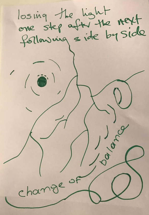 ‘found myself trying to create a structure out of materials while the rest of the group was connecting verbally; resonating with their words by listening not interacting.’