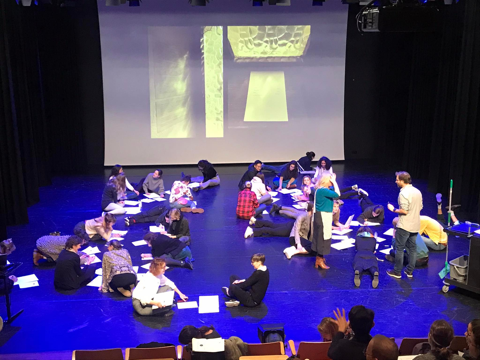 Performance maker and researcher Danae Theodoridou starts with another spatial, performative, participatory intervention. As the audience returns to the column-room after a coffee-break, the centre of the room is empty. We are seated on four lines of a square, facing the empty space in the middle. We are asked to step into the room one after the other, to either place an object in the room or ourselves. In the end everyone should find their proper place in this democratically stabilised space.