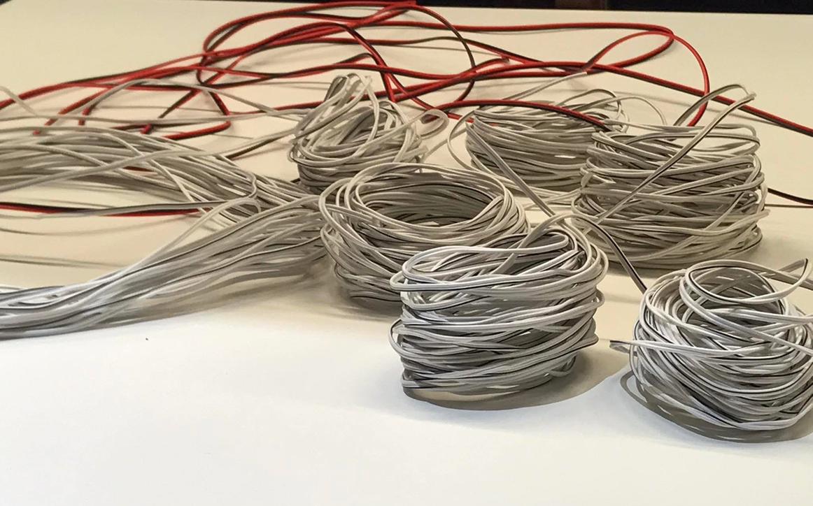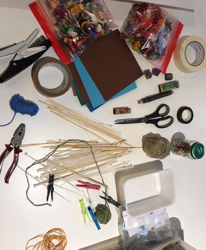 The space became even more messy in the third and final part of their contribution. We were asked to make groups of four and collect more material to create visual forms with. Within each group we were asked to reflect on questions concerning connectivity.[5] Rather than having merely conceptual conversation, we were invited to connect through the material objects by creating visual forms.