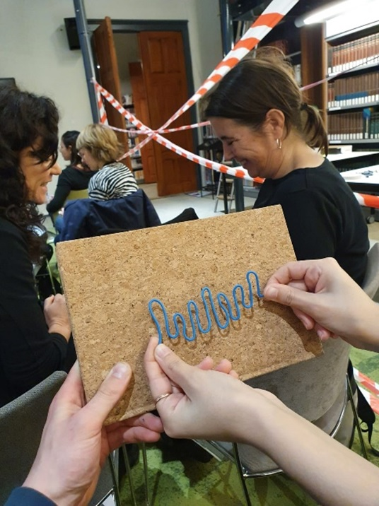 In the second part of their contribution ‘visual forms of connectivity’ would be co-constructed. We were asked to form duos and share what our research practice is like. I turned to my neighbour, Reyhaneh Mirjahani. I told her about my research practice which is about processes of identity-formation amongst youngsters through theatre. Reyhaneh was given the task to respond through creating a visual form of my story. She used one of the materials that Lizzy and Katy provided us with (a blue iron string, that could easily be bended, folded, twisted). And she created something very beautiful! You can see it in the photo here on the right. Each ‘wave’ of this form represents an individual (a youngster). The ‘inside’ of each wave represents the identity of each youngster (what one is). The ‘outside’ of each wave represents the potential space of each individual (what one could be). I was really touched by her visual creation, because it captured an important essence of what’s at stake in my research practice.