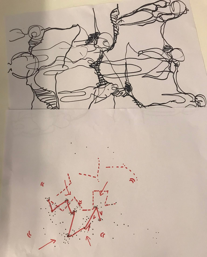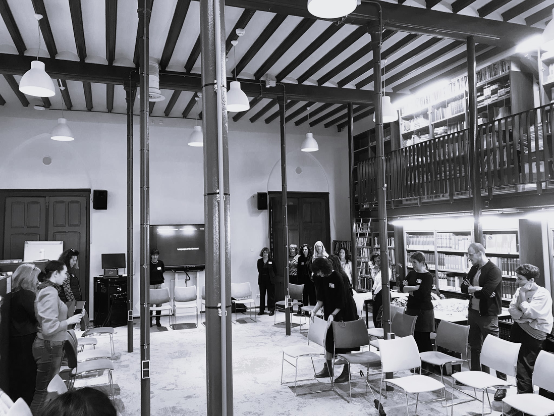 The third day started playfully. We gathered in the villa for coffee and tea. Then artistic researcher and artist Jessica Renfro invited us to do some morning stretching. These individual movements were followed by a game, in which we’d have to look around until we’d meet some other pair of eyes. And then we’d wink. Next, upon making contact with someone else in the room, we’d have to clap simultaneously. In a playful way, our minds and bodies were awakened and connected at the beginning of this new day. The warming-up was followed by a short story that Jessica told us. She took us into a fantasy world, to another planet with an open ending: “Once upon a time we called it _______...”