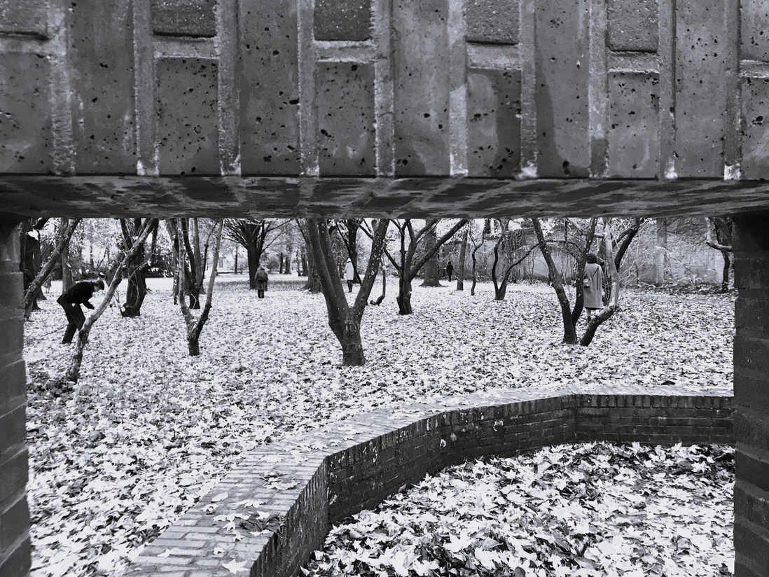 Fenced football court | trees | fallen leaves | brick temple-like structure