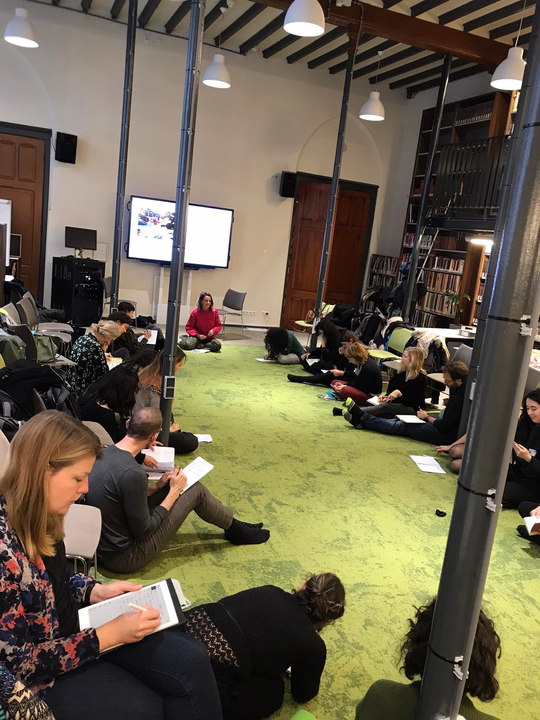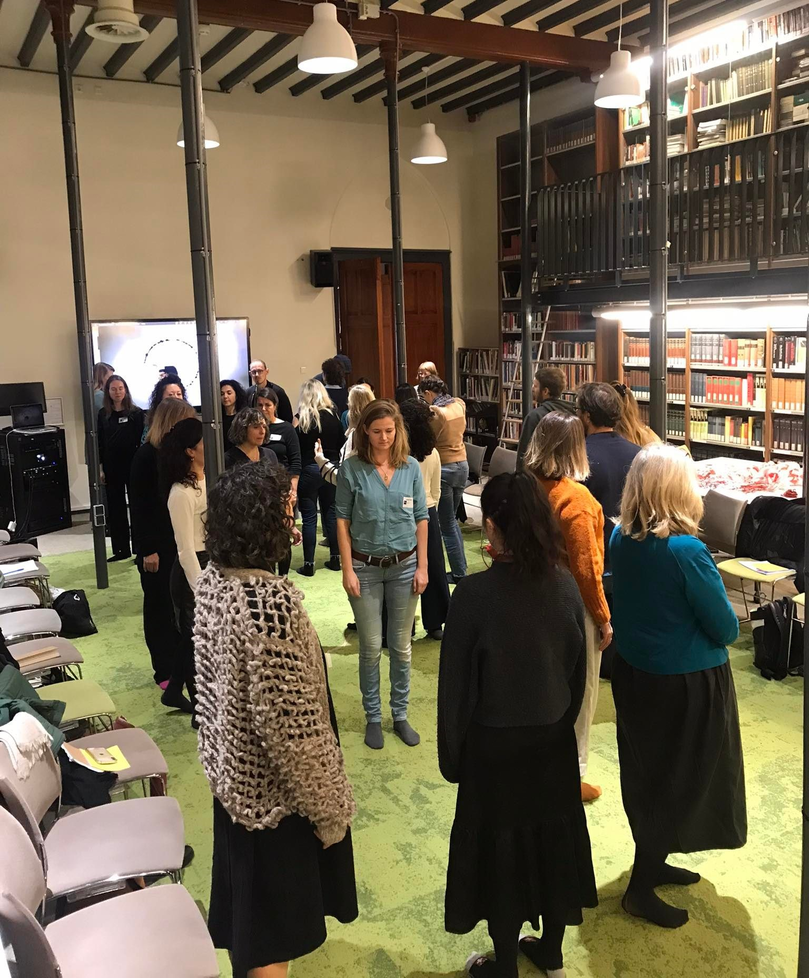 We gather in a large circle for the last time to reflect on the central notion of ‘artistic connective practices’. There is a brief deliberation on how to organise the conversation, which I see as an illustration of a connected way of working together. We’ve somewhat arrived at operating as a (temporary) community. There is spontaneous space for people to think together about how we organize ourselves. Later in the conversation, we are going to share some pretty tough thoughts, which I find meaningful. Throughout these three days, it seems as if we have created a safe space for friction.