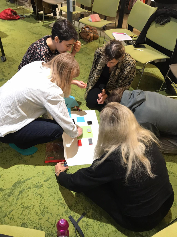Groups working with materials/discussing the notion of connection/reflecting/knitting threads/stretching bodies