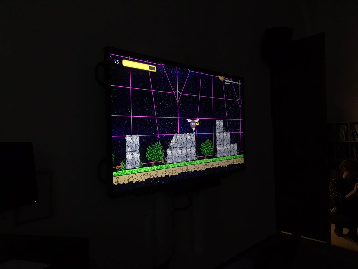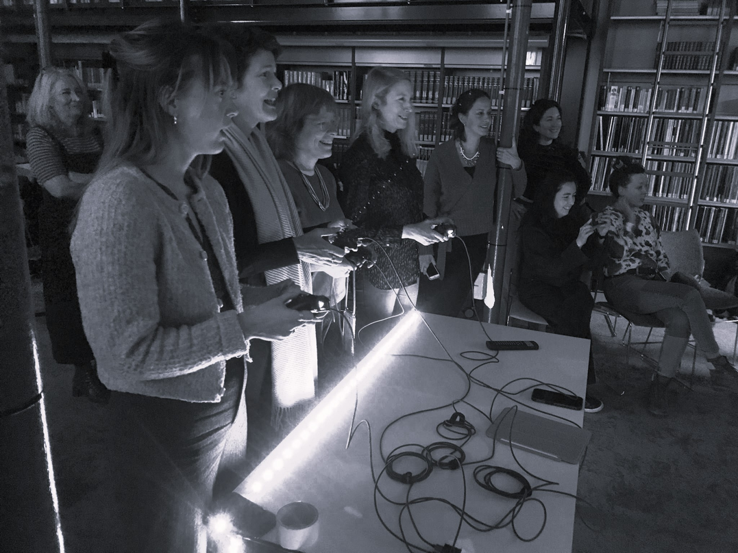 After having opened up our imagination we followed Jessica to the column-room, which had been transformed into a gaming-room. Four people were invited to control one organism together through a game-console. The space quickly transforms into a ludic learning place, as the players were having fun and gradually started understanding how to move together. When the game came to an end we were invited to have a loose discussion with Jessica on what we experienced, which gradually tranformed into a presentation of her work.
