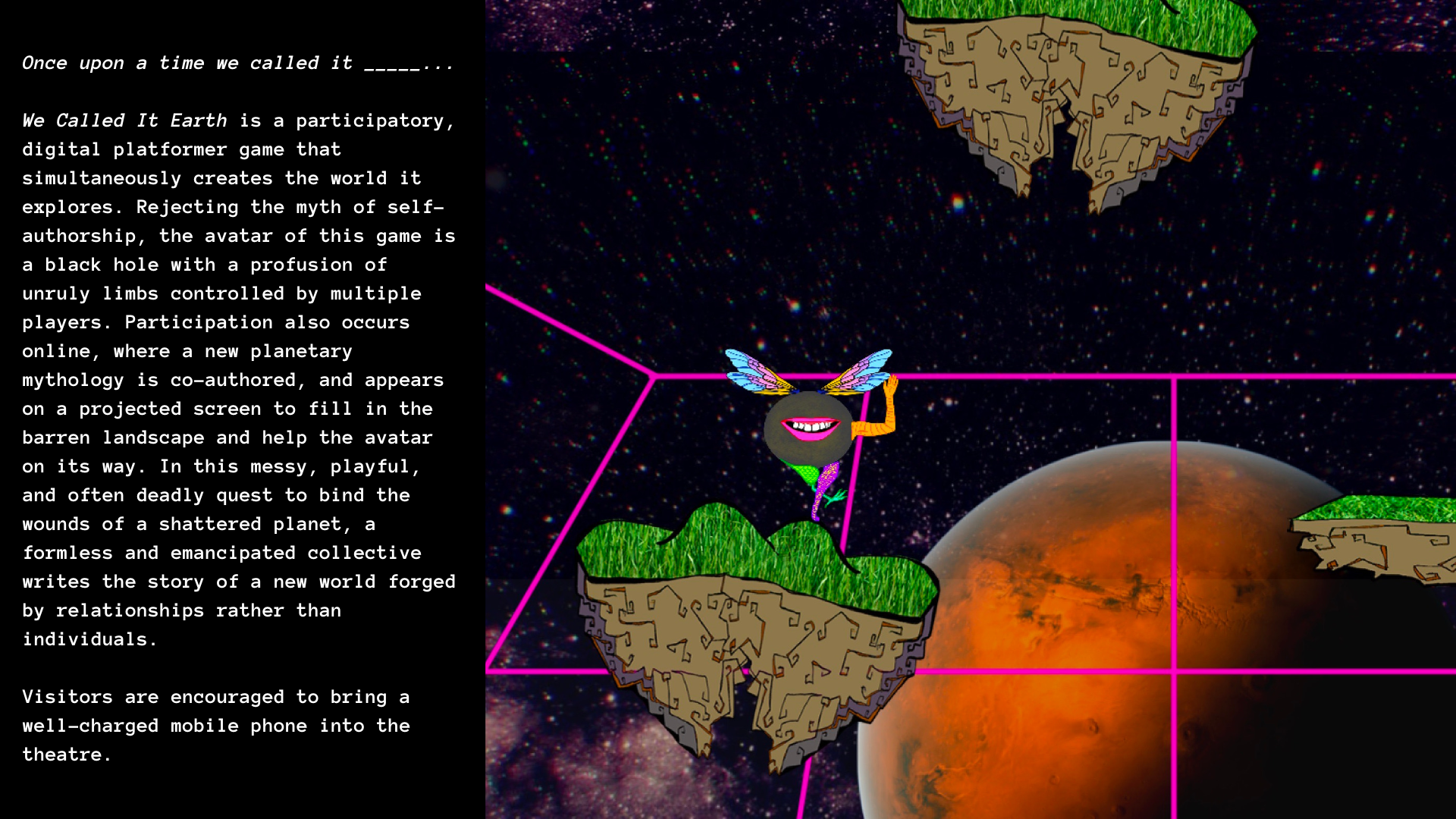 a 2D platformer game. An avatar also appeared as a black hole with brightly colored