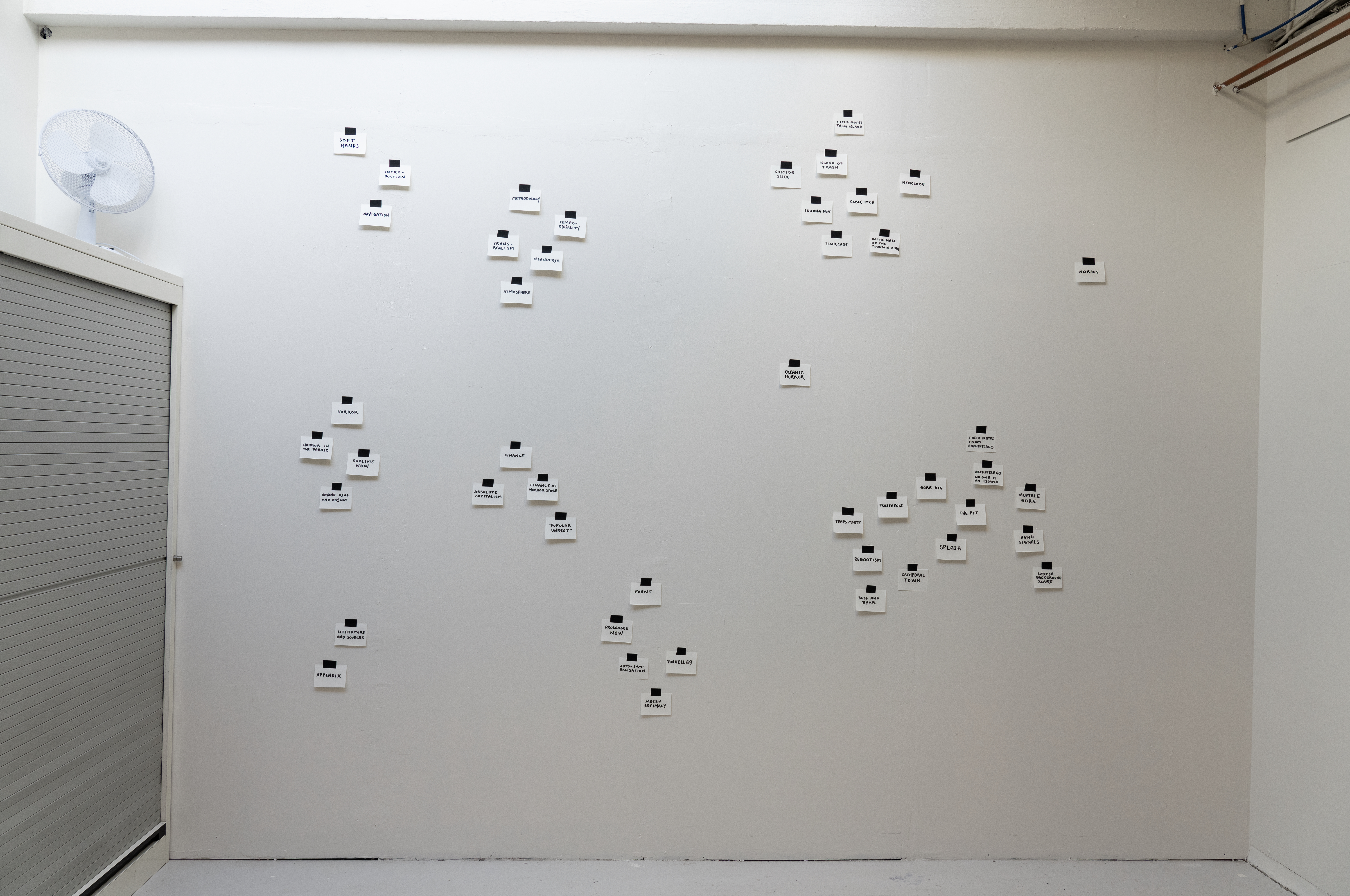 Søren Thilo Funder PhD in Artistic Research University of Bergen Faculty of Fine Art, Music and Design The Art Academy – Department of Contemporary Art Supervisors: Daniel Jewesbury, Darla Crispin, Anne Helen Mydland and Frans Jacobi. Artistic reflection and documentation of artistic result submitted in partial fulfillment of the requirements for the degree of Philosophiae Doctor (PhD) in Artistic Research at the University of Bergen. Date of public defence: 8.12.2023 'Oceanic Horror - or How to Survive the Night in the Haunted Mansion of Absolute Capitalism' is an artistic research project that explores the potentials of utilising the genre of horror fiction to create new narratives in a political and time-based art practice. It is invested in the temporal qualities and entanglements of the horror genre and how these relate in strange ways, not only to our current tempor(e)ality and the modes of financialisation that informs this, but also to art practices using the temporal as material. Framed around the revisiting of the mid-nineties trading firm 'Island' in the advent of high frequency trading and its successor the trading company 'Archipelago', pushing the algorithmic trading systems further into the splash of web 2.0, 'Oceanic Horror' uses the methodologies of Transrealism and Meandering to create new nonlinear narrations revolving around the relationship between the opaque structures of absolute capitalism and the socio-political horror experienced in everyday life. The research project searches for a certain condition found in horror fiction, that relates to its relentless nowness, its proposed prolonging of this now, its relation to eventality and the quasi-event and finally how horror fiction wants to do things to the body - not only in a simple reaction mode but really in the very temporality experienced in and by the body. The artistic result of 'Oceanic Horror' was exhibited at Kunsthall 3.14 in Bergen 21.04.2023 - 04.06.2023, comprising a multi-channel video installation combining digital renderings with fictional cinematic scenes in an immersive total installation of office furniture sculptures forming makeshift sleep stations in the exhibition space. The reflection for 'Oceanic Horror' is presented in this Research Catalogue exposition, including both written material, images and a comprehensive archive of all the video works that make up the entangled narratives of 'Oceanic Horror - or How to Survive the Night in the Haunted Mansion of Absolute Capitalism' Norwegian: 'Oceanic Horror - or How to Survive the Night in the Haunted Mansion of Absolute Capitalism' er et kunstnerisk forskningsprosjekt som utforsker mulighetene i sjangeren skrekkfiksjon til å skape nye utrykk og narrativer i politisk og tidsbasert kunstpraksis. Prosjektet utforsker skrekksjangerens temporale oppbyggning, estetikk og kvaliteter. 'Oceanic Horror' anvender både som kunsteriske metoder og utrykk 'transrealisme' og 'meandering' for å skape nye ikke-lineære fortellinger og kunst som dreier seg om forholdet mellom de ugjennomsiktige strukturene i 'absolutt kapitalisme' og den sosio-politiske 'horroren' som oppleves i hverdagen. Med utgangspunkt i historien om det reelle handelsfirmaet 'Island', som i midten av nittitallet var med i oppstarten av høyfrekvent aksjehandel, og dens etterfølger, selskapet 'Archipelago', som ledte bølgen av algoritmiske aksjehandelssystemer i web 2.0, søker forskningsprosjektet etter en viss tilstand som finnes i horror fiction, som relaterer seg til dens nådeløse nåhet, dens foreslåtte forlengelse av dette 'nå', dets forhold til 'event' og 'kvasi-event' og hvordan horror fiction ønsker å gjøre ting med kroppen - ikke bare i en enkel reaksjonsmodus, men egentlig i selve temporaliteten som oppleves i og av betrakterens kropp. Det kunstneriske resultatet av 'Oceanic Horror' ble vist på Kunsthall 3.14 i Bergen 21.04.2023 - 04.06.2023. Utstillingen besto av en flerkanals videoinstallasjon som kombinerer digitale gjengivelser med fiktive filmatiske scener. Vist i en totalinstallasjon av kontormøbelskulpturer som danner provisoriske sovestasjoner i utstillingsrommet. Den kunsteriske refleksjonen som følger 'Oceanic Horror' presenteres på Research Catalogue og inkluderer både tekster, bilder og et omfattende arkiv av alle videoverkene som utgjør de sammenfiltrede fortellingene til 'Oceanic Horror - or How to Survive the Night in the Haunted Mansion of Absolute Capitalism'