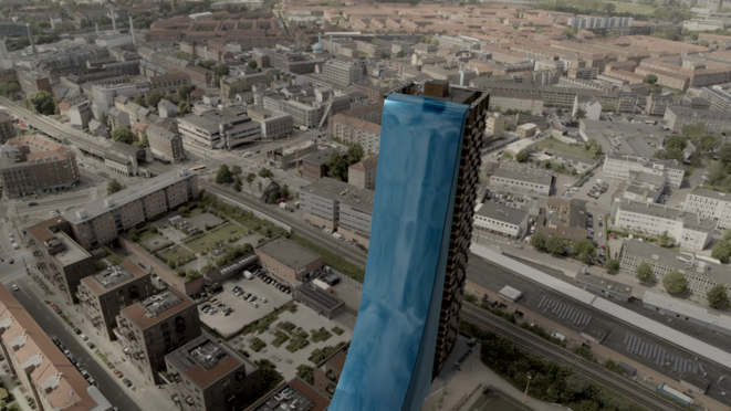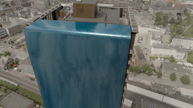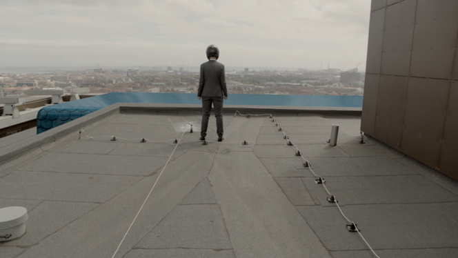 The landscape, of this sequel to the scene playing out in NYC, is far removed from its original Manhattan context. This was not initially the case. The shoot of the broker on the high-rise roof was planned to take place in New York City. But due to COVID-19 it was not possible to return to America to film the scene. As the outlook to borders opening up grew more and more distant, I decided to make the recordings in a landscape that would relate directly to the context of Kunsthall 3,14, instead. The scene was now planned to play out on Fløyen, a mountain range towering above the city of Bergen. When a visitor of Kunsthall 3,14 would exit the building, the sloping mountain side would be there, unavoidably on the horizon. The narrative of the suicide broker, would have been transported to the two storey (bank) building of Kunsthall 3,14, and hence the mountain plateau would be the only place high enough for the suicide/thrill ride to be possible. And Josh had already considered that the face of an existing cliff would be the perfect place for this parabolic curve. This shoot in Bergen, was unfortunately also made impossible, once again due to COVID-19, since I myself was stuck in Copenhagen at the moment. So a final decision was made to bring the scene 'back home' and situate it around a newly developed high-rise in the midst of the area called Nord Vest in Copenhagen. A high-rise nicknamed 'The Brown Tower'. A high-rise that if anything really is an unavoidable beacon of the ongoing and escalating gentrification of this neighbourhood. The obstacles around this production, somewhat shows that the meandering approach is not always voluntary. A very specific visuality is forced into a completely other. A truly iconic landscape (Manhattan skyline) is transposed with a more locally appreciated, or viewed from outside more generic. But the practice of meandering is also building up a readying mechanism, making decisions evolve in an open-ended space that is ready for transformation. Openness towards changing circumstances, loosing control, letting narratives deform and mutate. That 'The Brown Tower' stands alone, in the landscape, as sole skyscraper, enables a completely different visuality than had it been squeezed in between so many others. The whole notion of the mathematical/statistical curve towering above an area deeply submerged in the suffocating soup of gentrification would in the initial setup never have surfaced.