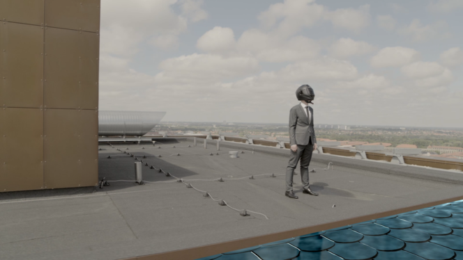 The culminating drone shots of the towering slide, are envisioned as forming a transformation in the contextualisation of the work in relation to its production value. The more direct and simplistic blocking of the staircase recordings, as the broker makes his way to the roof, is suddenly taken over by an impossible shot. The camera lifts, travels sky high and displays the slide in all its ludicrous grandeur. I was searching for a certain comical moment, a comic relief, to all the brooding sequences of Cable ITCH. With the semicircular drone shot hovering ambitiously around the sloping slide, twinkling in the sunlight, stretching into and through the surrounding houses, I tried to construct something epic, that would never content-wise live up to its claim. A funny, unrealistic and outright preposterous proposal, elevated to the prolific and godlike. Much like neoliberal ideology and economy.