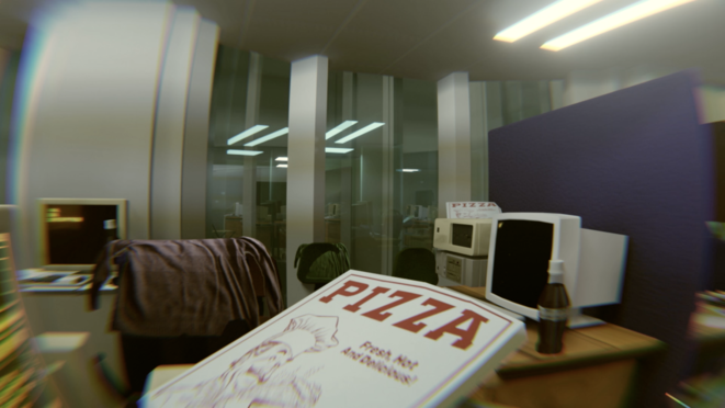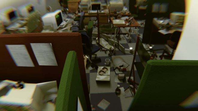 The lack of source material, part from this one image and the few written accounts of the messy environment collected in Scott Patterson’s book, made me ultimately decide to recreate the office spaces as I imagined them. A 3D environment was built up around these written accounts, using the blueprints of the office floors, and a lot of research on nineties product designs. The space was pieced together in collaboration with CGI animator Laurence Kirk Weedy, working from London.