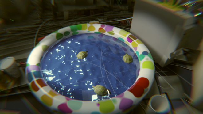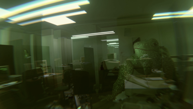 The office spaces are in a certain way revisited from the rocking POV of Joshua’s pet iguana. A revisiting of this place that is purely virtual; completely dreamt up and assembled by data code; a compile of visual signifiers of time and environment. This process followed a rather classical work method in contemporary art: The finding of a significant place (in the world and in time) and an aesthetic coverage of this place – often together with the input of a second source; a written document narrated by a voice actor or a performer doing something within the place. This method shares traits with the reenactment of a historical occurrence. Here the perspective on said occurrence, or event, is key to the critical potential of the reenactment art work. A new perspective (say that of the people’s) enabling a space for the creation of counter-memory – a new narrative offered; one that contests the authoritative histories written by pen-wielding blood soaked hands of white men. In 'Cable ITCH (I don’t wanna work at Island no more)' a significant place in the world and in time is revisited indeed. But the offices, and the time they are depicted in, is a pure construct, built from the ground up in minuscule virtual building blocks. There is no place, just a horrendous reimagining of an environment and a number of signifying objects speaking to a time period. It is a transrealist visualisation of the place and the state that it is left in. As reenactment, the virtual camera performing iguana POV, most certainly explores the setting from a new perspective. I decided to use the POV of the Iguana, not only to offer a certain non-human view and frame of reference, but also simply to allow for this landscape to be experienced from a different angle – the angle of the trash. All the waste scattered around the floor – the disorder that paints such a contrast to the orderly images we have of the systems of money transactions and the realm of coding – casts a gaze back up on the elevated mountainous work stations. With this choice I sought to prompt a look awry onto the structuring forces of the finance economy, for the viewer to inhabit. The iguana POV, together with the piling trash, is intended to form a common visual portal into a realm exclusively for the in-the-knows. It creates a weird normal, introduced into the pristine logic; into that which is too complicated to fully explain, and hence must be revered as a immaculate system that must be barred from messy human interference.
