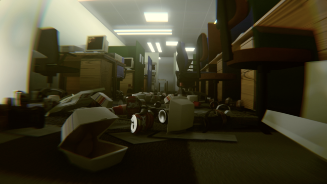 In the uncontaminated realm of the binary code, all the trash speaks to this messy human interference. With the chunks of chocolate bars, the tilted trash bins, the crushed soda cans; comes the smell of periodontitis saliva, the violent puking of overworked nervous systems and the adrenalin sweat pouring off the hand that did the crushing; the hint of something corporeal. But the way that the office spaces in 'Cable ITCH' speak to the corporeal is really in its complete exclusion. I decided that there would be no bodies in the space, only the remainders of bodily activity, traces of human agents. Where all the trash may constitute a weird contribution to the logic of the space, the fact that no humans are present is intended to evoke a sense of the eerie. I wanted to evoke a bodily experience, but this through a constant referring to the absent body.