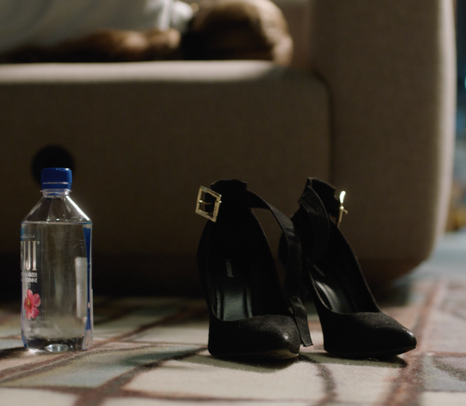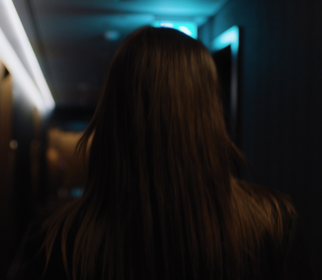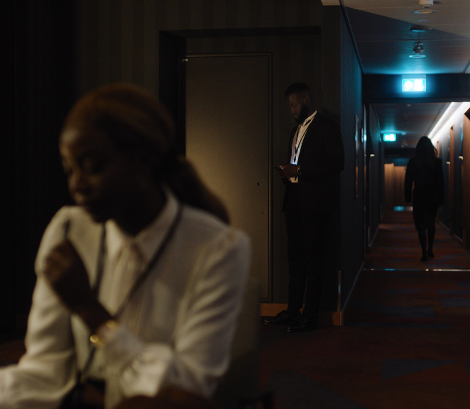 The installation at Kunsthall 3,14 was designed to form an archipelago. Separated small islands of furniture or screens, together forming a cluster of islands. In this same way, the dramatic structure of the central two channel video work in the exhibition also shapes an archipelago in itself. Every character inhabiting the depicted environment form an island within herself, literally plugged in to a closed circuit; AirPods in ear; screen glued to face. These isolated islands form a cluster of islands that together form a detached yet hyperconnected fractal landmass strewn in an inhospitable ocean. The blocking of both camera and actors in the production of this filmic material, was intentionally designed to emphasise this image of isolation in the connected. The choice to let this nonlinear narrative unfold on two screens, was made to allow for the montage to focus attention on this partitioning/connecting relationship. The two channel montage allows for actors to recognise each other’s ghostlike presence, from each their screen. It allows for a lingering in the solitary while opening up connecting worlds in the adjacent screen reality. It allows for a situation to be represented from multiple angles, thus forcing an objective gaze outside human sensory faculty upon a situation. And physically it somehow allows for the screens to become self-contained entities that at moments suddenly emerged into one unified screen; two islands rhythmically oscillating between correspondence and polarity, melting into one screen portal. On a technical level - one that might go unnoticed by the general viewer, but may speak to our unconscious recognition of the cinematic - the two screens shifts screen-reality from two separated 4:3 projections to one integrated 2.35:1 Cinemascope format.