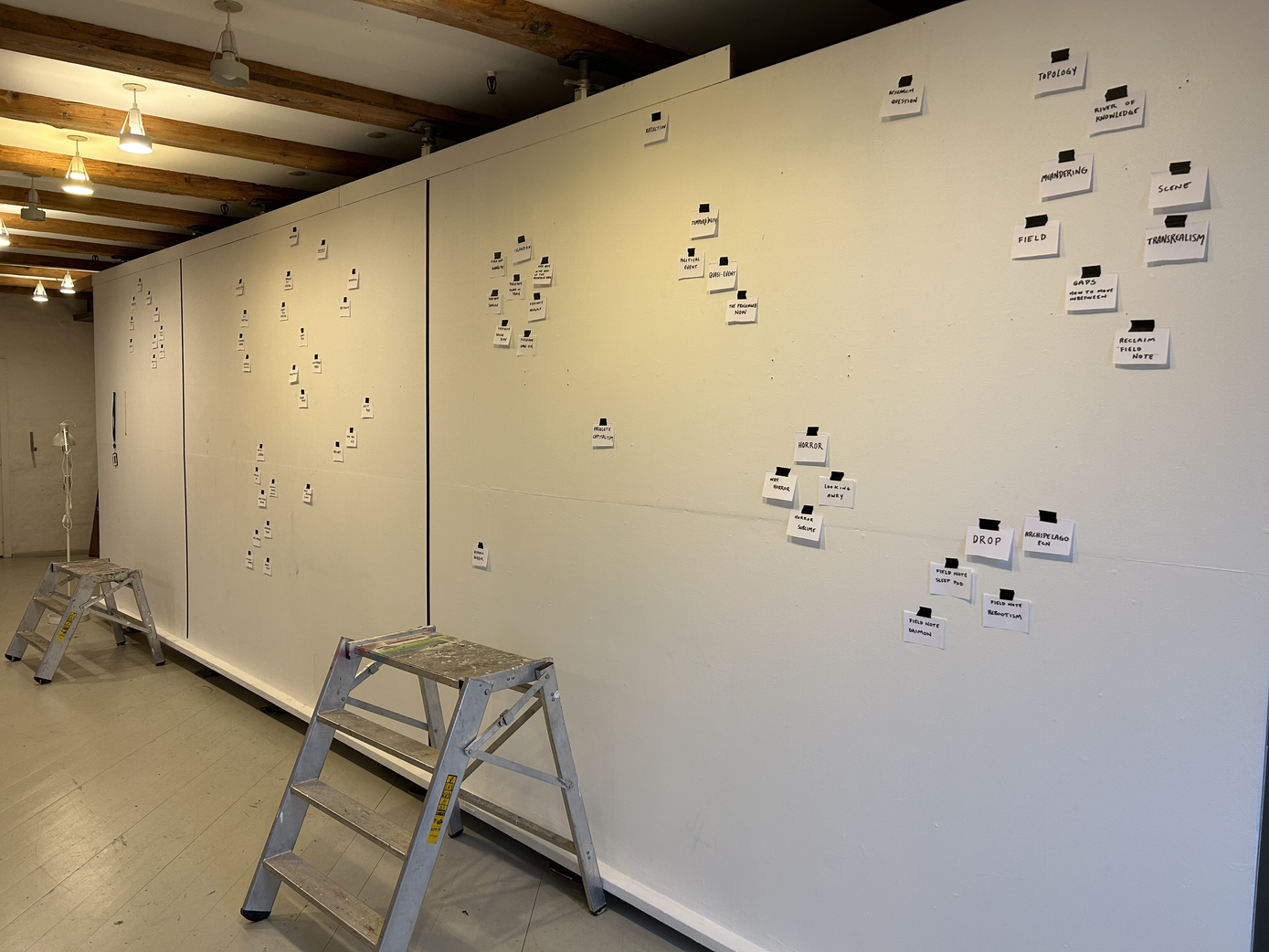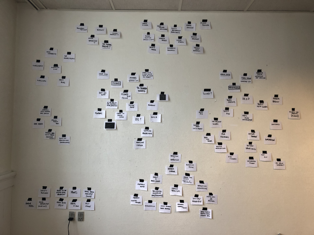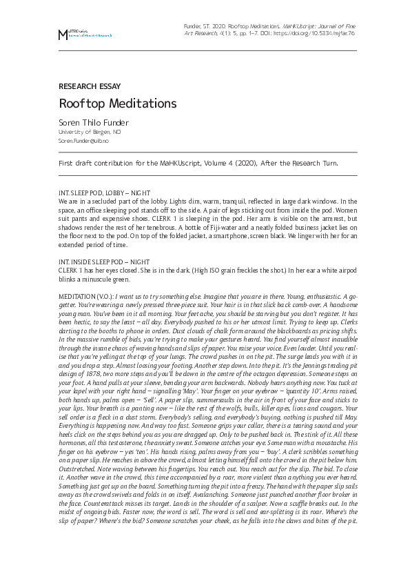 Søren Thilo Funder PhD in Artistic Research University of Bergen Faculty of Fine Art, Music and Design The Art Academy – Department of Contemporary Art Supervisors: Daniel Jewesbury, Darla Crispin, Anne Helen Mydland and Frans Jacobi. Artistic reflection and documentation of artistic result submitted in partial fulfillment of the requirements for the degree of Philosophiae Doctor (PhD) in Artistic Research at the University of Bergen. Date of public defence: 8.12.2023 'Oceanic Horror - or How to Survive the Night in the Haunted Mansion of Absolute Capitalism' is an artistic research project that explores the potentials of utilising the genre of horror fiction to create new narratives in a political and time-based art practice. It is invested in the temporal qualities and entanglements of the horror genre and how these relate in strange ways, not only to our current tempor(e)ality and the modes of financialisation that informs this, but also to art practices using the temporal as material. Framed around the revisiting of the mid-nineties trading firm 'Island' in the advent of high frequency trading and its successor the trading company 'Archipelago', pushing the algorithmic trading systems further into the splash of web 2.0, 'Oceanic Horror' uses the methodologies of Transrealism and Meandering to create new nonlinear narrations revolving around the relationship between the opaque structures of absolute capitalism and the socio-political horror experienced in everyday life. The research project searches for a certain condition found in horror fiction, that relates to its relentless nowness, its proposed prolonging of this now, its relation to eventality and the quasi-event and finally how horror fiction wants to do things to the body - not only in a simple reaction mode but really in the very temporality experienced in and by the body. The artistic result of 'Oceanic Horror' was exhibited at Kunsthall 3.14 in Bergen 21.04.2023 - 04.06.2023, comprising a multi-channel video installation combining digital renderings with fictional cinematic scenes in an immersive total installation of office furniture sculptures forming makeshift sleep stations in the exhibition space. The reflection for 'Oceanic Horror' is presented in this Research Catalogue exposition, including both written material, images and a comprehensive archive of all the video works that make up the entangled narratives of 'Oceanic Horror - or How to Survive the Night in the Haunted Mansion of Absolute Capitalism' Norwegian: 'Oceanic Horror - or How to Survive the Night in the Haunted Mansion of Absolute Capitalism' er et kunstnerisk forskningsprosjekt som utforsker mulighetene i sjangeren skrekkfiksjon til å skape nye utrykk og narrativer i politisk og tidsbasert kunstpraksis. Prosjektet utforsker skrekksjangerens temporale oppbyggning, estetikk og kvaliteter. 'Oceanic Horror' anvender både som kunsteriske metoder og utrykk 'transrealisme' og 'meandering' for å skape nye ikke-lineære fortellinger og kunst som dreier seg om forholdet mellom de ugjennomsiktige strukturene i 'absolutt kapitalisme' og den sosio-politiske 'horroren' som oppleves i hverdagen. Med utgangspunkt i historien om det reelle handelsfirmaet 'Island', som i midten av nittitallet var med i oppstarten av høyfrekvent aksjehandel, og dens etterfølger, selskapet 'Archipelago', som ledte bølgen av algoritmiske aksjehandelssystemer i web 2.0, søker forskningsprosjektet etter en viss tilstand som finnes i horror fiction, som relaterer seg til dens nådeløse nåhet, dens foreslåtte forlengelse av dette 'nå', dets forhold til 'event' og 'kvasi-event' og hvordan horror fiction ønsker å gjøre ting med kroppen - ikke bare i en enkel reaksjonsmodus, men egentlig i selve temporaliteten som oppleves i og av betrakterens kropp. Det kunstneriske resultatet av 'Oceanic Horror' ble vist på Kunsthall 3.14 i Bergen 21.04.2023 - 04.06.2023. Utstillingen besto av en flerkanals videoinstallasjon som kombinerer digitale gjengivelser med fiktive filmatiske scener. Vist i en totalinstallasjon av kontormøbelskulpturer som danner provisoriske sovestasjoner i utstillingsrommet. Den kunsteriske refleksjonen som følger 'Oceanic Horror' presenteres på Research Catalogue og inkluderer både tekster, bilder og et omfattende arkiv av alle videoverkene som utgjør de sammenfiltrede fortellingene til 'Oceanic Horror - or How to Survive the Night in the Haunted Mansion of Absolute Capitalism'