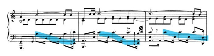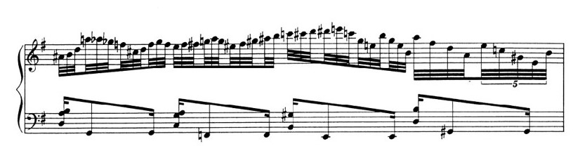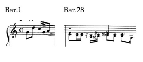 The left hand always proposes phrases that move in a diatonic way ex: bar.10, bar.17, bar.23; -while right hand phrases have a larger motion, often featuring intervals of fourths and fifths. The melodic cell presented in bar 1, is a melodic fragment composed of 5 notes built on the pentatonic of A minor; the first interval consists of a leap of an ascending fifth G-D and then descending by a conjunct degree to C, followed by a descending leap of a fourth to G and then resolving by a conjunct degree to A.
