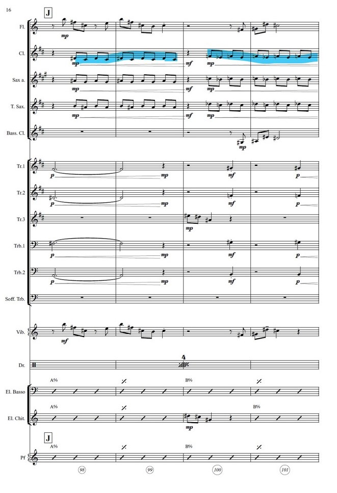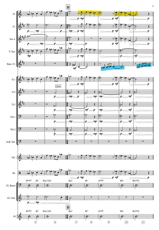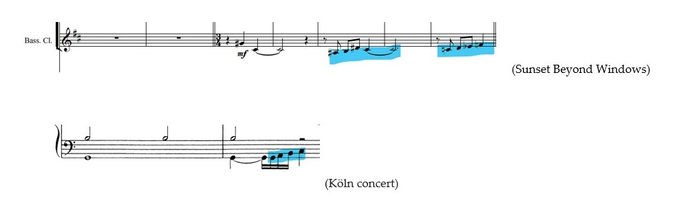 Both cells have the same melodic direction, but are transposed into another key; in the concert in Köln the melody is built on the C major scale, while in my piece it is presented in A major and then modulated in Bb minor (consider that the bass clarinet is a transposing instrument in Bb).
