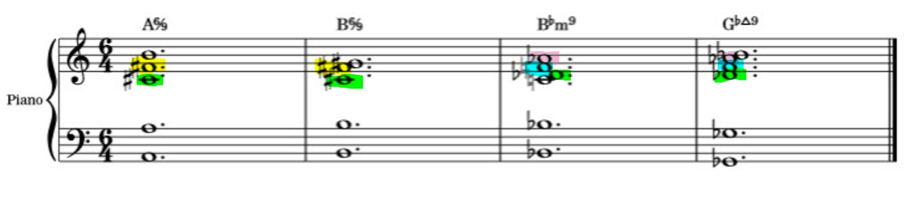 Here is an example taken from the first 4 chords of the piano solo progression.