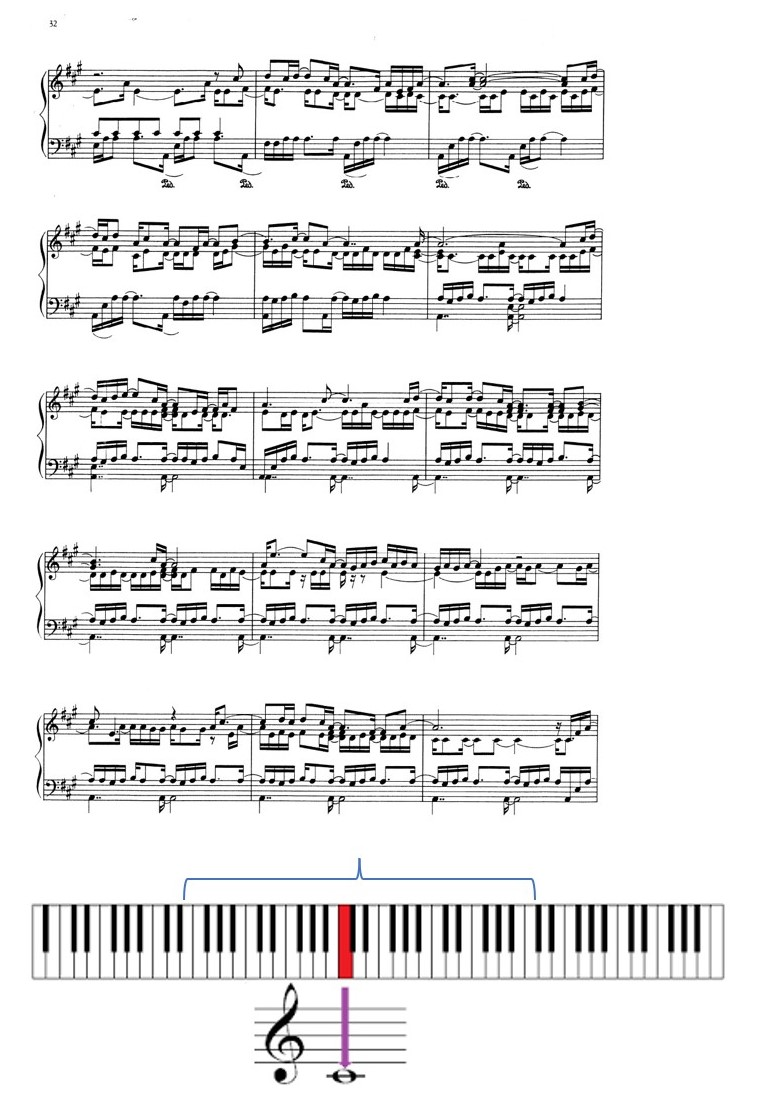 As can be seen on the score, all the thematic elements are developed between the E1 bass key and C5.