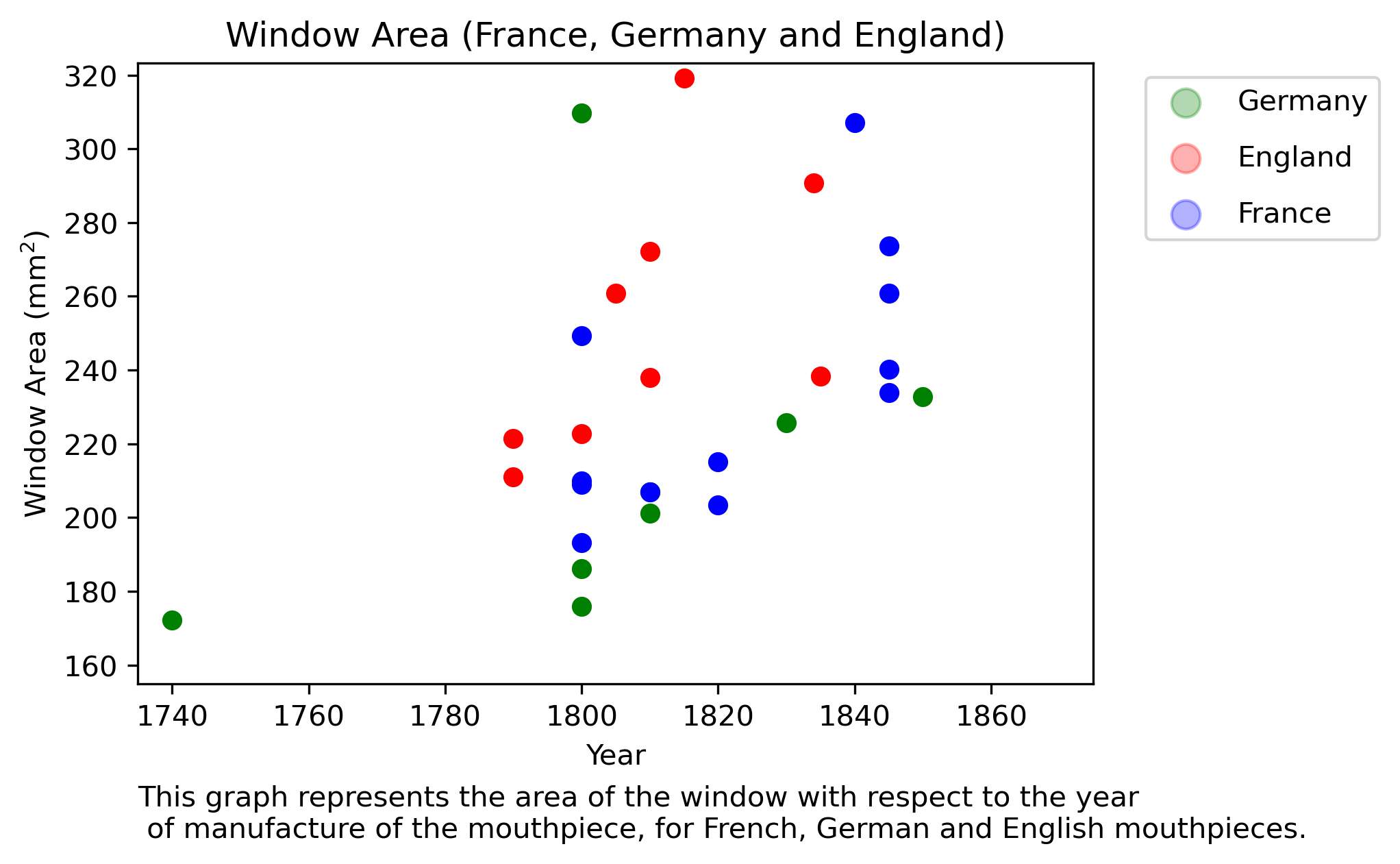 - We see a more evident change in France than in Germany regarding the growth of the width of the top of the window and the window area, together with a bigger change in the shape of the window. As mentioned before, these facts could reflect the fact that, in the 1800s, reed above and reed below options co-existed much more in Germany than in France, where almost only reed up was employed. Therefore, an evolution towards an only reed below position would have a greater effect on the mouthpiece design in France than in Germany.