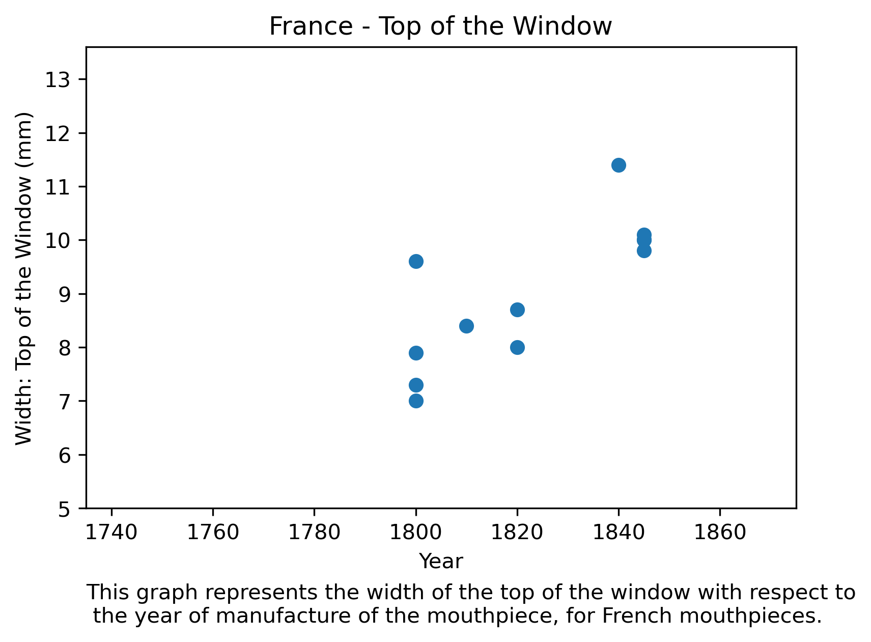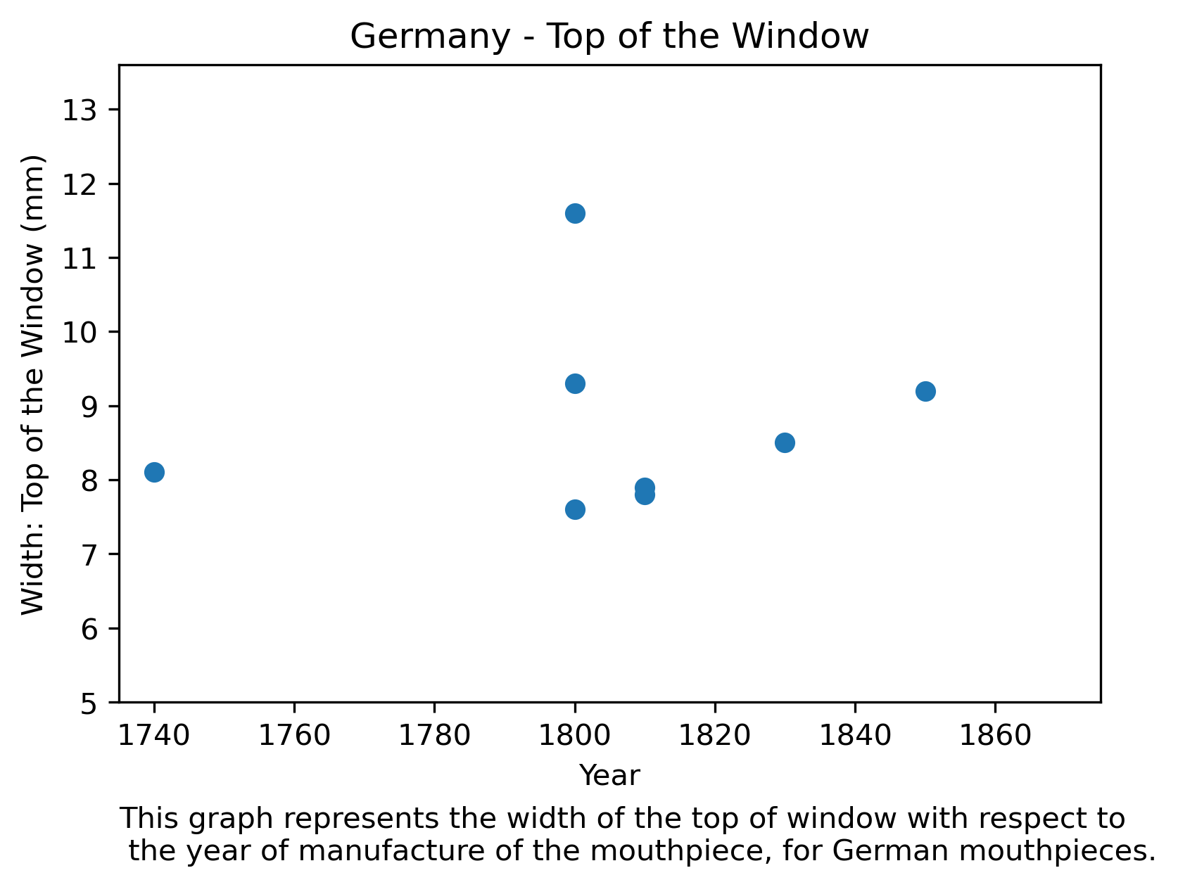 In the next two graphics, we see a representation of the width of the top of the window with respect to the year, in Germany and France, respectively. The width of the top of the window is used also as a proxy of the mouthpiece tip wideness: usually, if a mouthpiece has a wider top part, it will result in a wider top part of the mouthpiece.