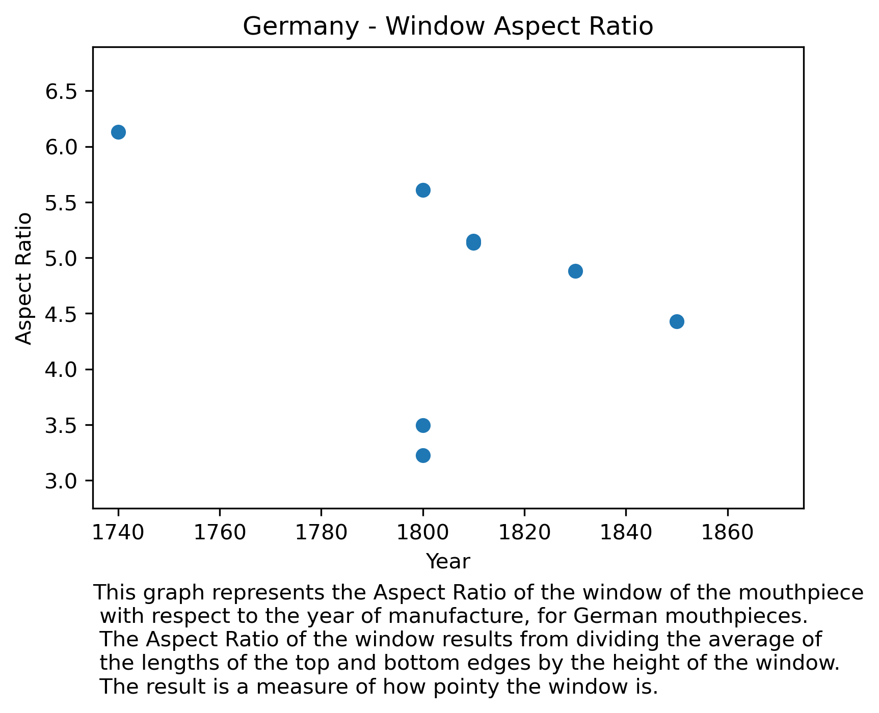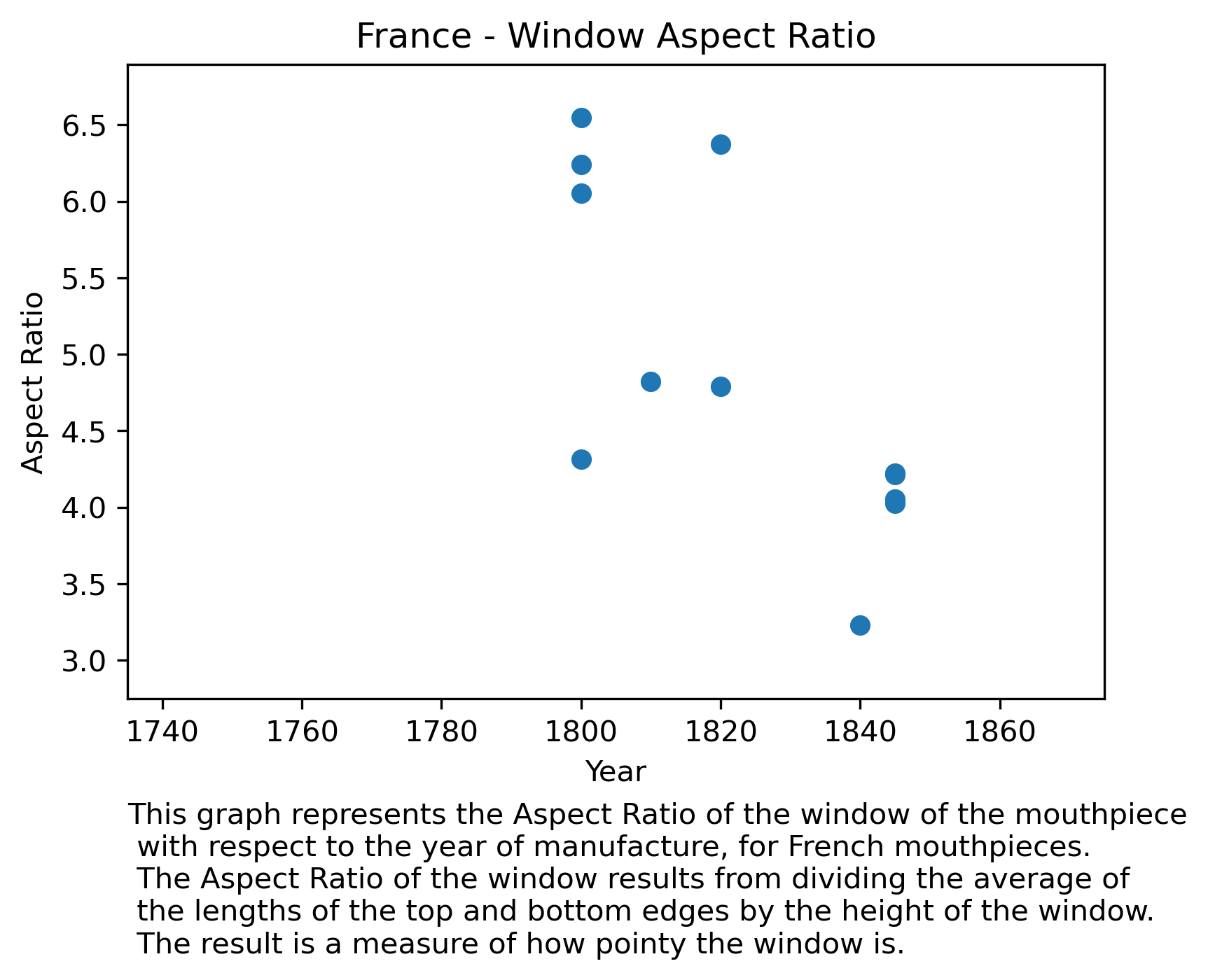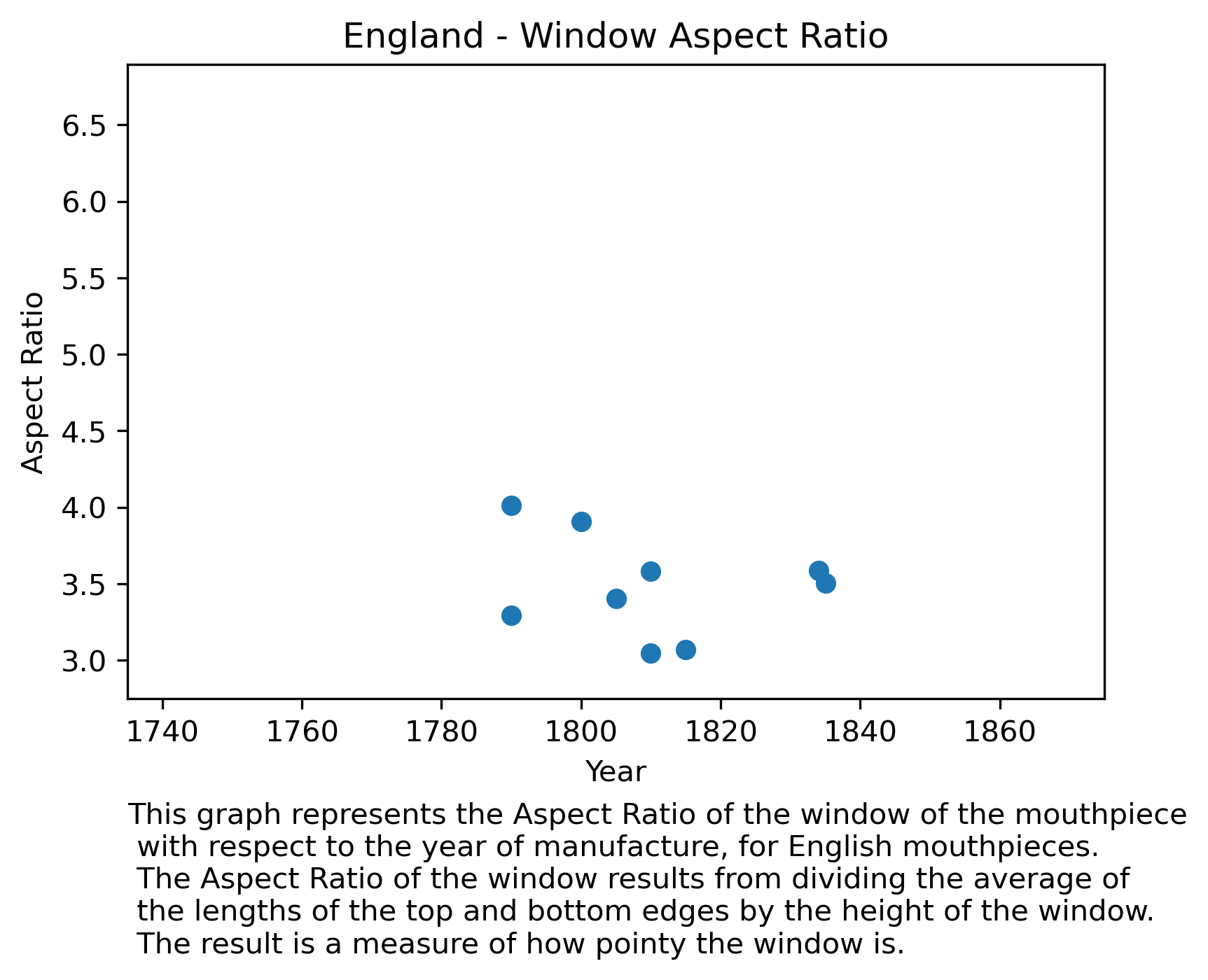 We don’t observe any change in Aspect Ratio in England: this means that the windows from mouthpieces didn’t change how pointy or not they are. This is probably related to English mouthpieces having very squared windows from the beginning of the 19th century: they could not get much more squared.