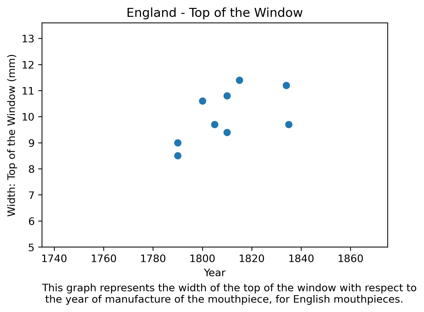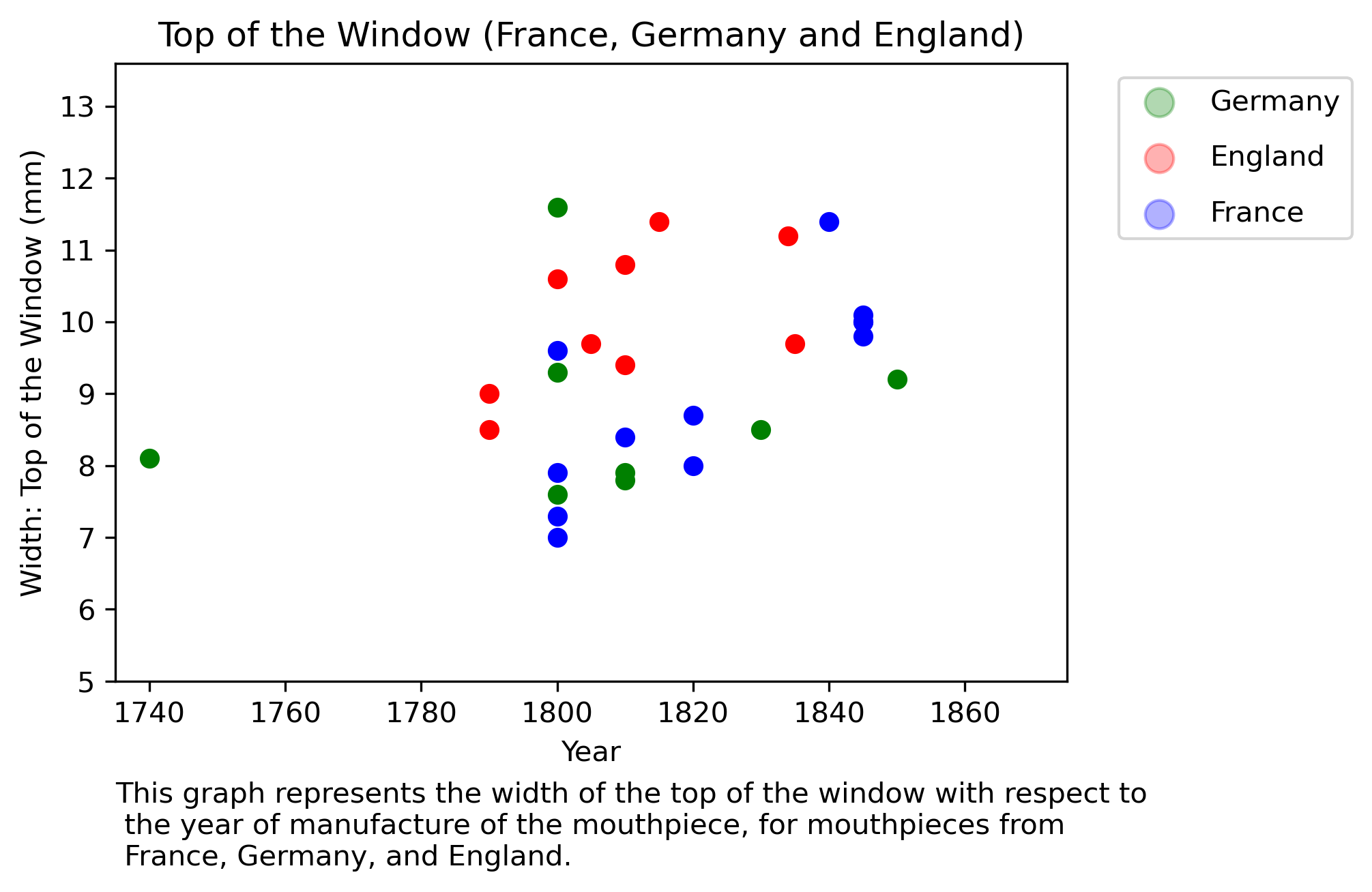 In England, we see an early increment in the width of the top of the window, unlike France, which has a later increment in this parameter. This could reflect that already in 1800 we find mentions of the two methods for positioning the reed in English tutors. Also, the points are a bit dispersed, this could be due to the coexistence of the two trends during the period: there are records of at least one English virtuoso playing with reed facing up till 1840.3