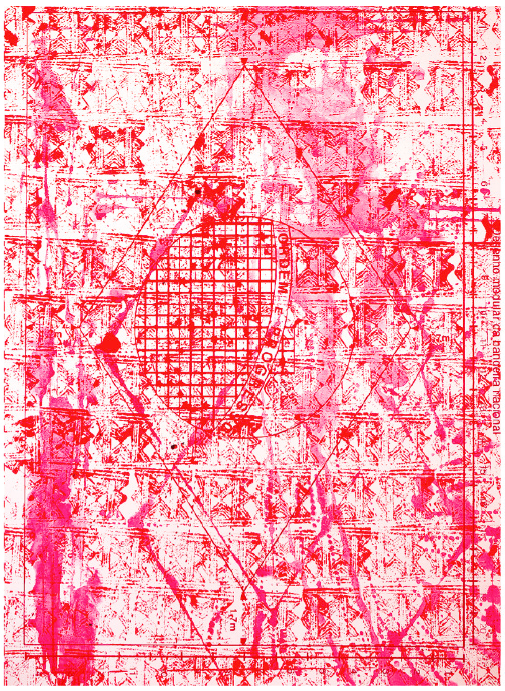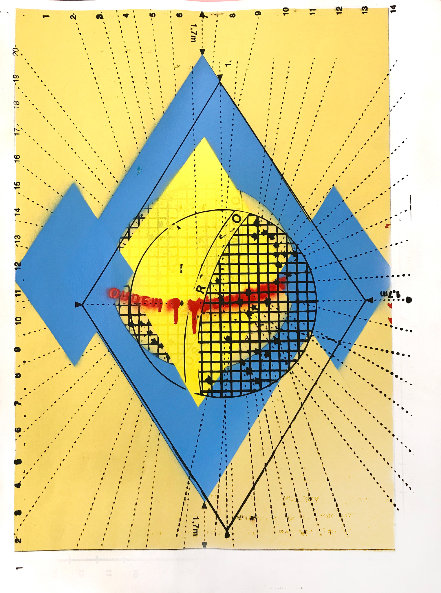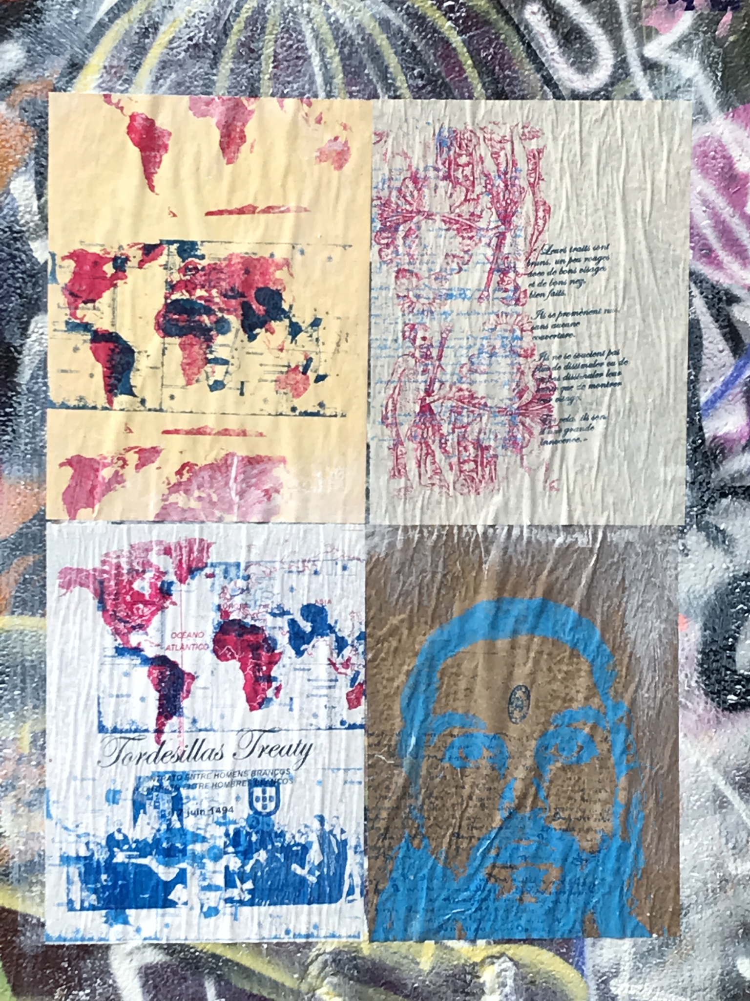 En tant qu’artiste/chercheur immigrant d'origine brésilienne, ma recherche-créationen arts visuels vise la transformation des symboles coloniaux, surtout des images, présents dans l'imaginaire collectif brésilien, avec une approche décoloniale. Ma recherche-création est une mise en pratique de certains principes de la décolonialité décrits par des penseurs comme Walter Mignolo, Catherine Walsh et Rolando Vasquéz. Mon intérêt se tournevers la production visuelle eurocentrique (peinture, gravure, cartographie, lettres, documents, etc.) créée par des Européens et des Brésiliens qui, selon mes hypothèses de recherche, ont contribué à la construction de l'imaginaire colonial brésilien. Dans ma pratique en art d’impression, je m'approprie des lettres, des cartes, des gravures, des seaux, des timbres, des blasons, des photographies et des drapeaux, ainsi que des peintures historiques et des gravures pour les manipuler, les mettre en relation les uns avec les autres, afin de composer mon discours artistique qui dénonce le nettoyage idéologique et les génocides perpétrés par les colonisateurs européens au Brésil. Dans ma recherche à la maîtrise, j’essaie de décoloniser mon imaginaire brésilien en utilisant des images-source, soit de la peinture historique ou des archives coloniales, pour raconter des récits visuels cachés par l’histoire officielle blanche hétéronormative.