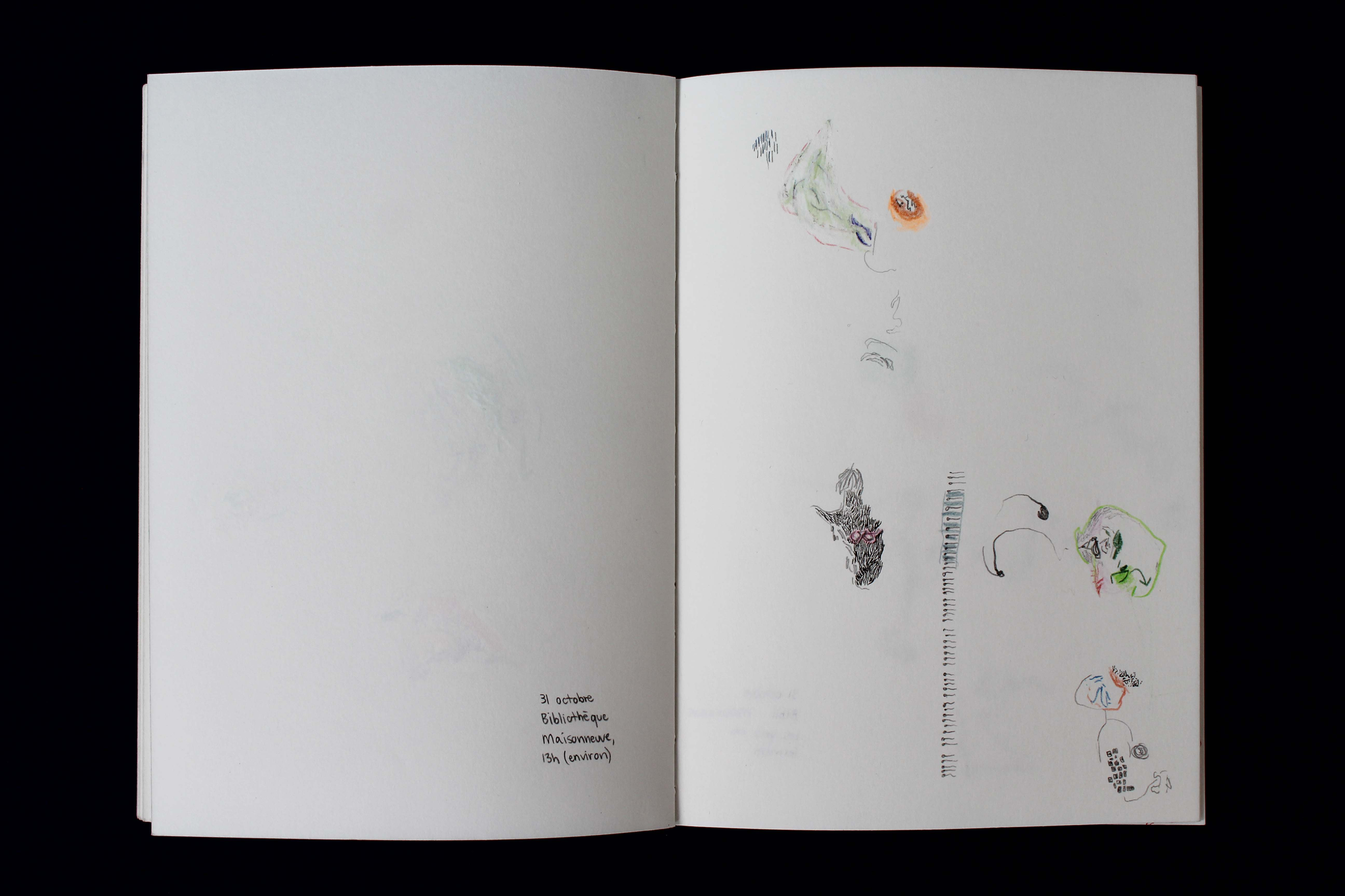 Ma pratique méditative du dessin dans l’espace public m’aide à m’ancrer dans le moment présent et à développer une attention fine au contexte social qui me contient et me traverse. Je me dépose dans des lieux de passage ponctuant mes trajectoires quotidiennes et j’entre dans un état de réceptivité. Assise par exemple sur un banc de la rue Sainte-Catherine, je laisse mon regard suivre les pas des gens autour de moi. J’embrasse la porosité de mon être en traçant dans mon cahier les parcours dont je fais l’expérience par l’observation. Mes dessins prennent la forme de minuscules plans illustrant le positionnement de mon corps et de celui des autres dans l’espace, de petits schémas communiquant nos mouvements respectifs et de traductions visuelles abstraites des sons ambiants. Chaque image miniature que j’élabore représente à l’échelle de l’intime la totalité de l’expérience d’un instant de recueillement dans la ville.