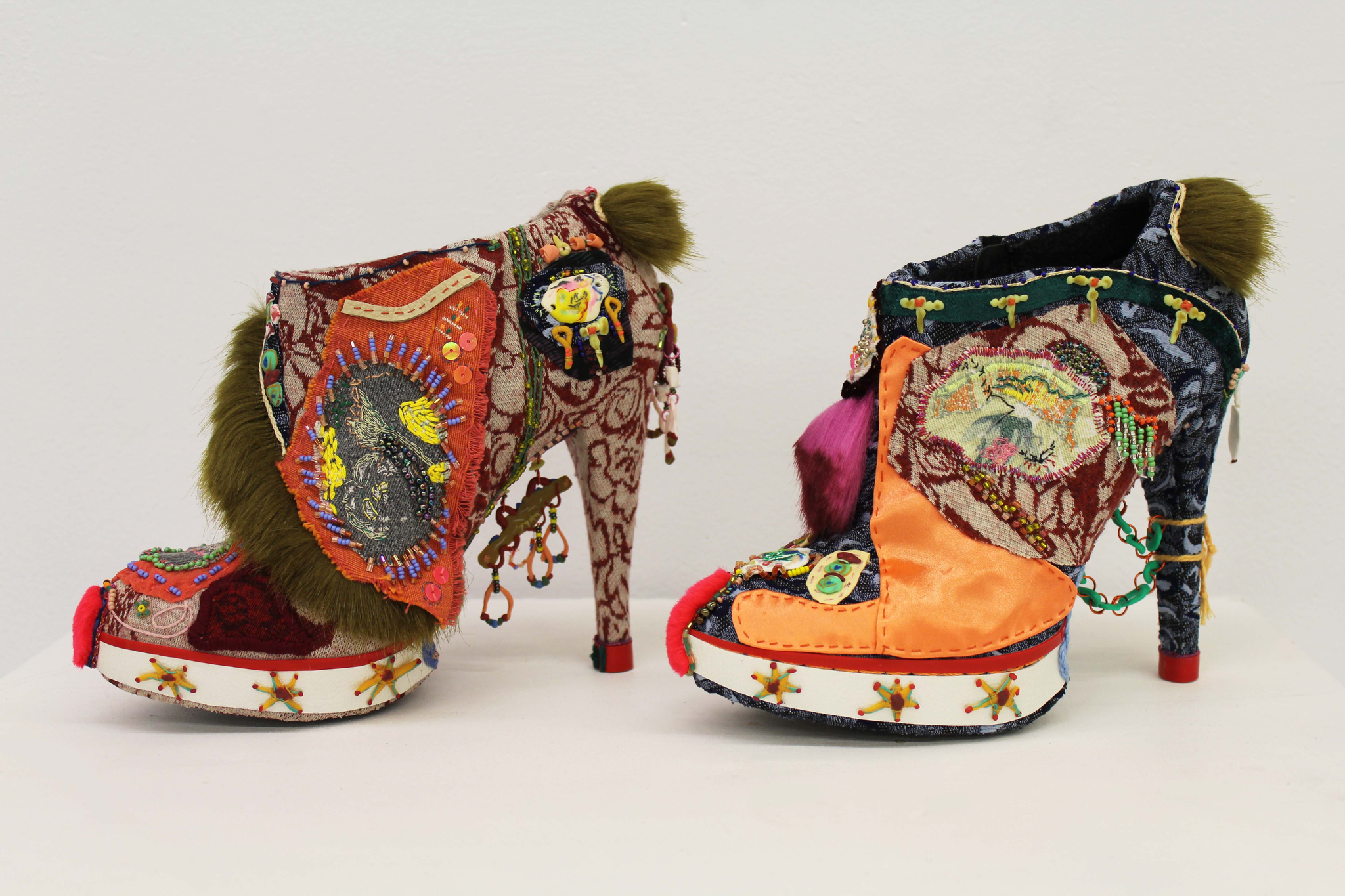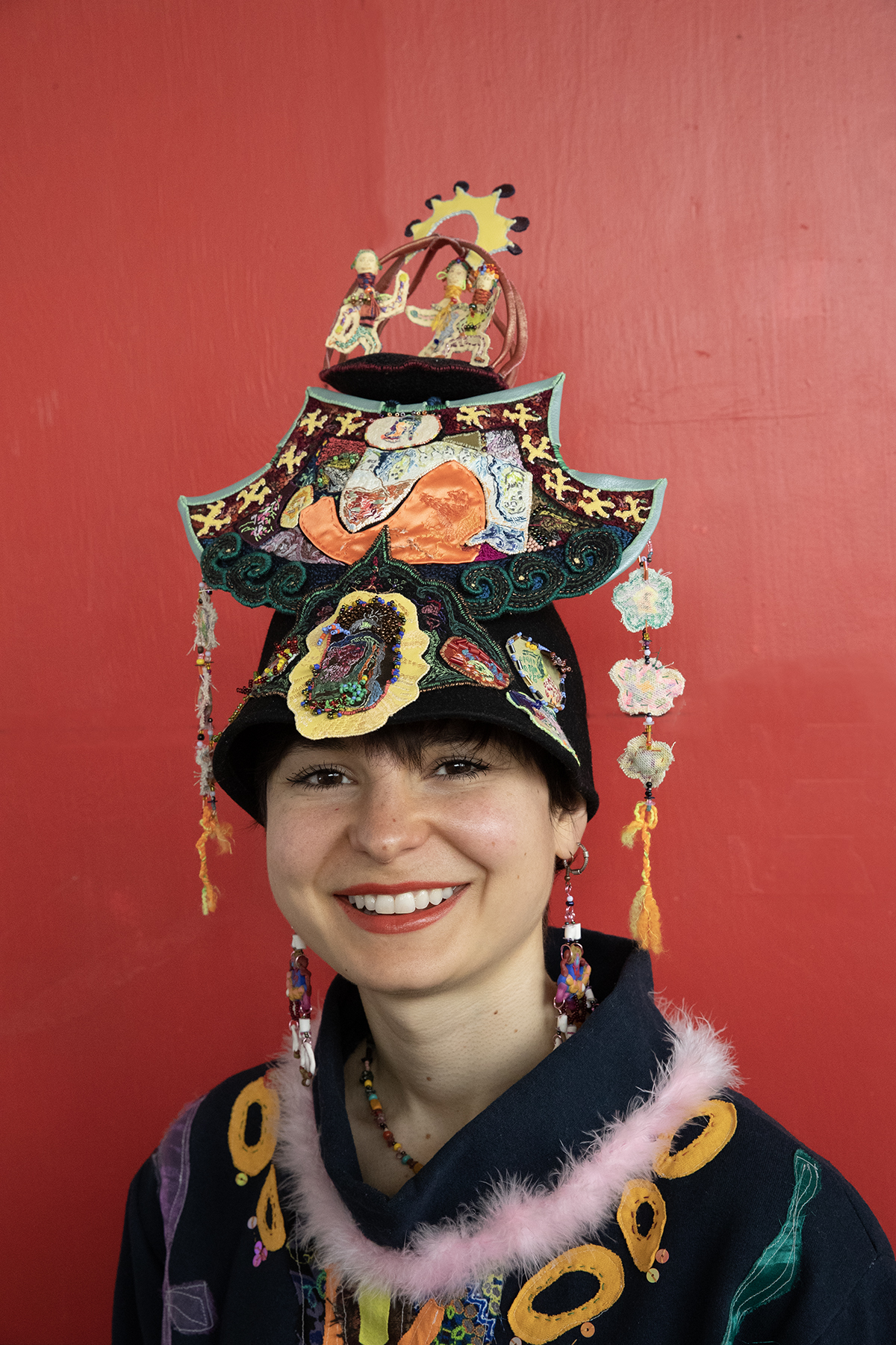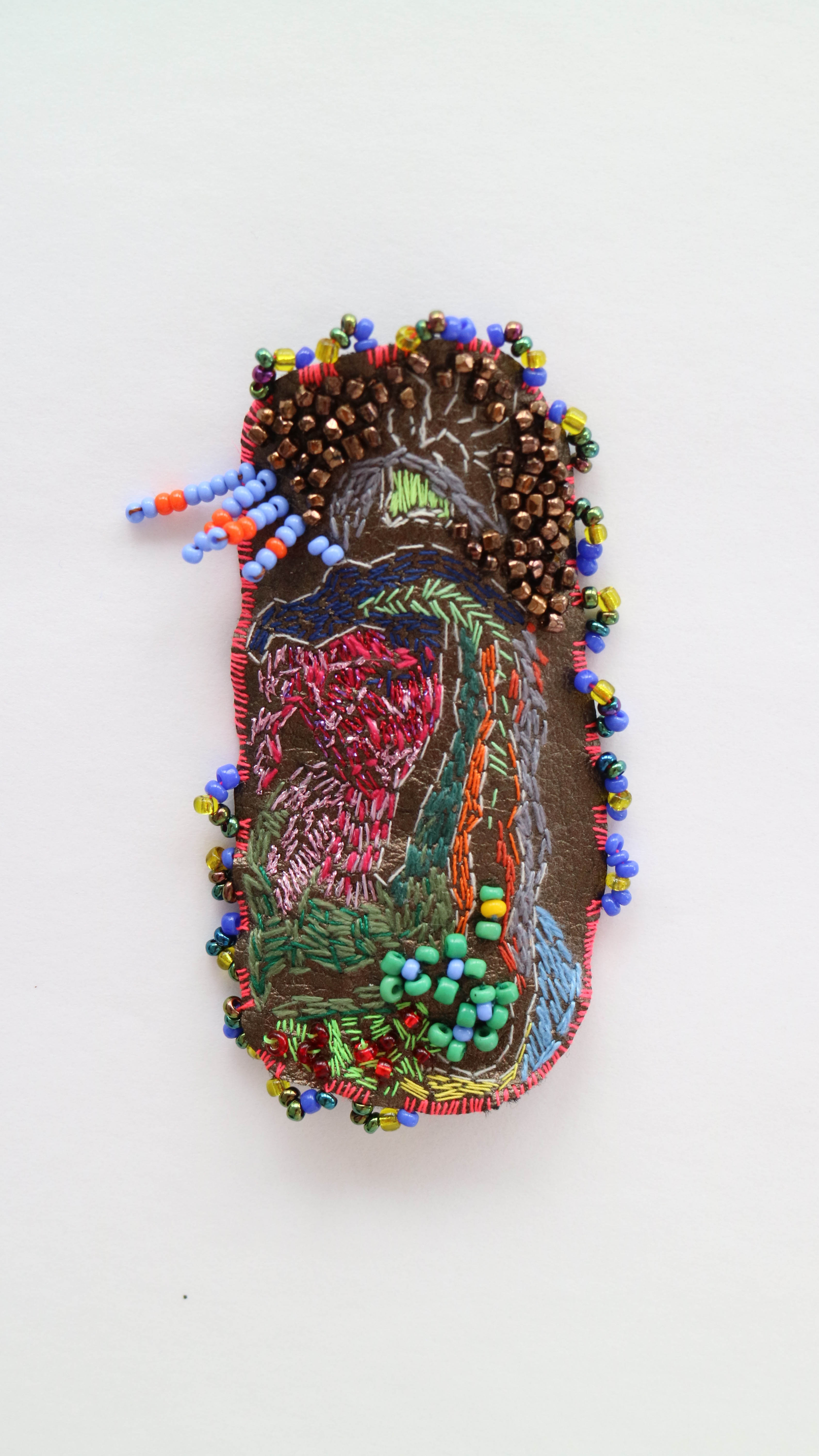 Décorés des broderies, de billes et de tissus divers, les accessoires et vêtements que j’élabore constituent une deuxième peau communiquant la manière dont je vis sensiblement. Mon costume célèbre par ses couleurs et son extravagance ma capacité à ressentir, à imaginer et à m’exprimer. J’associe mon travail à la joie qui, selon les activistes carla bergman et Nick Montgomery, « renvoie à notre capacité à affecter et à être affecté.e.s, à prendre activement part à la transformation collective, à accepter d’en être bouleversé.e.s. La joie […] est une façon d’habiter pleinement nos mondes » (bergman et Montgomery, 2017/2021, quatrième de couverture). Encouragée par leur parole et celle d’autres auteur.e.s féministes comme Audre Lorde, j’honore mon besoin de rêver par la création de parures pour mon corps.